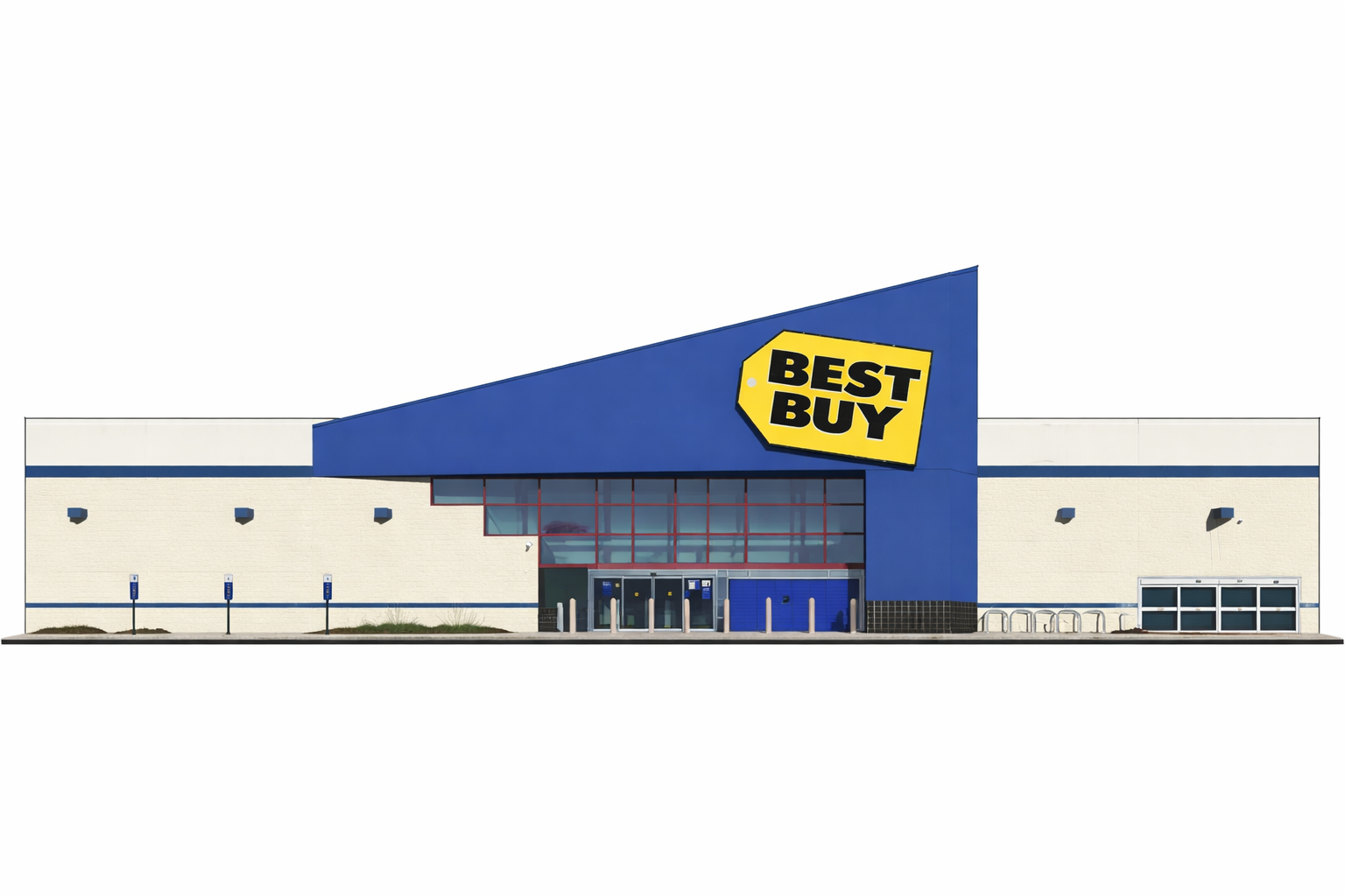 create a realistic and beautifully rendered image of a modern industrial warehouse building on an overcast day the building should have light grey concrete walls with darker grey accents and metallic elements such as railings and stairs in cool steel tones the windows should appear as dark blue reflective glass add vibrant yellow safety bollards in front for contrast the sky should be overcast with soft diffused lighting to create a calm atmosphere the ground is paved with smooth grey asphalt slightly darker than the building walls with subtle shadows to add depth and realism