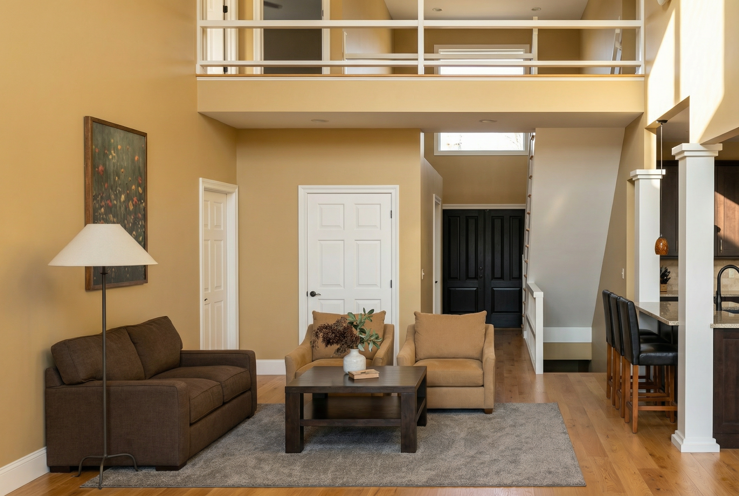 the doors and trim are white the double door is black the floor is a natural oak hardwood the chairs are a camel velvet color the sofa is a pinecone color the railing is white the bar stools are black leather with wood legs the cabinets on the right are espresso the walls are a wheat beige color the rug is a beige and mustard distressed rug