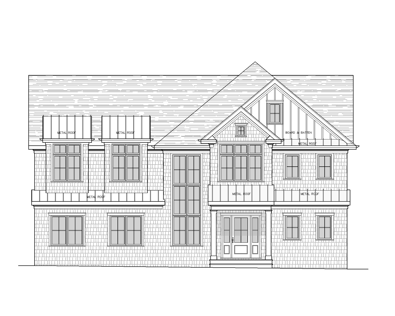 modern farmhouse look white stucco siding dark dray standing seam metal roofs where labeled and dark asphalt roofing otherwise simple serene modern landcaping driveway to the right side