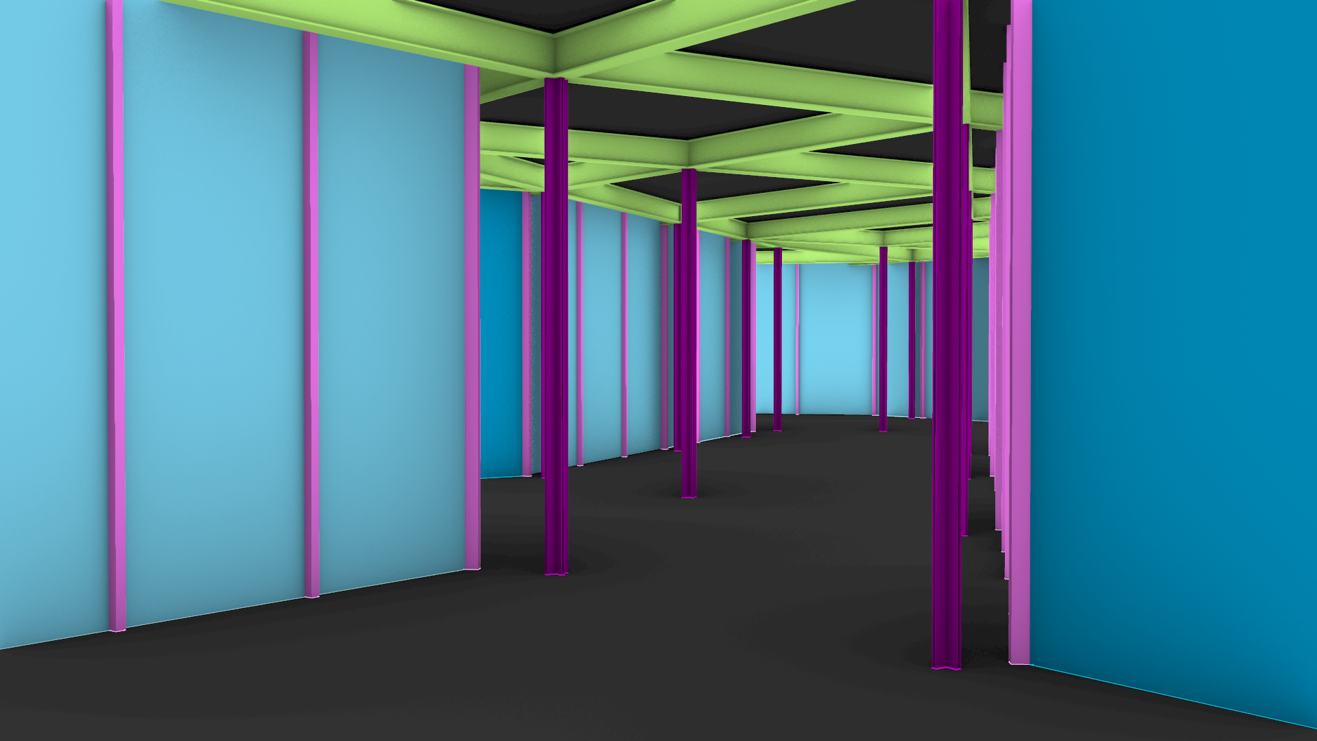 light blue will indicate transparent glass darker blue will indicate frosted opaque glass light pink represents the steel window frames as well as the columns and beams which should remain visually distinguishable from one another the floor should be a dark grey raw seamless porcelain stoneware while the ceiling should be lighter in tone