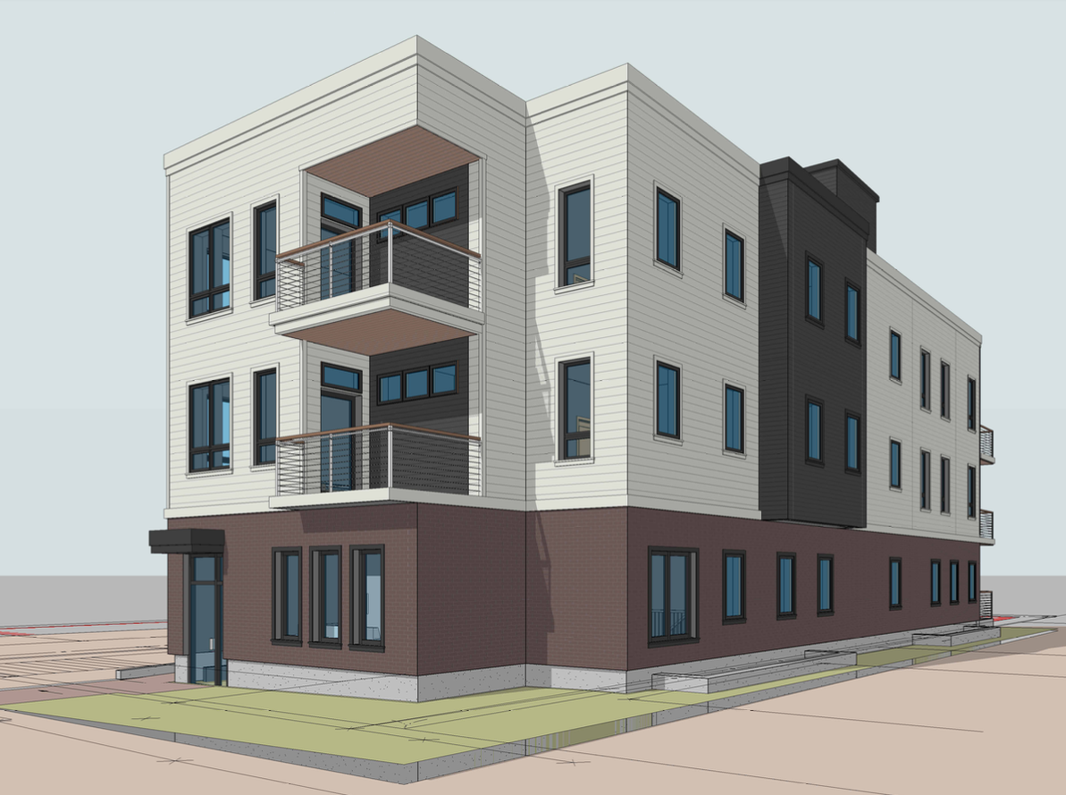 create a photorealistic version of this building keep all windows brick siding and white siding exactly in their current locations and proportions do not alter the overall structure replace all areas of dark grey siding with a medium beige color maintain realistic lighting texture and materials architecture