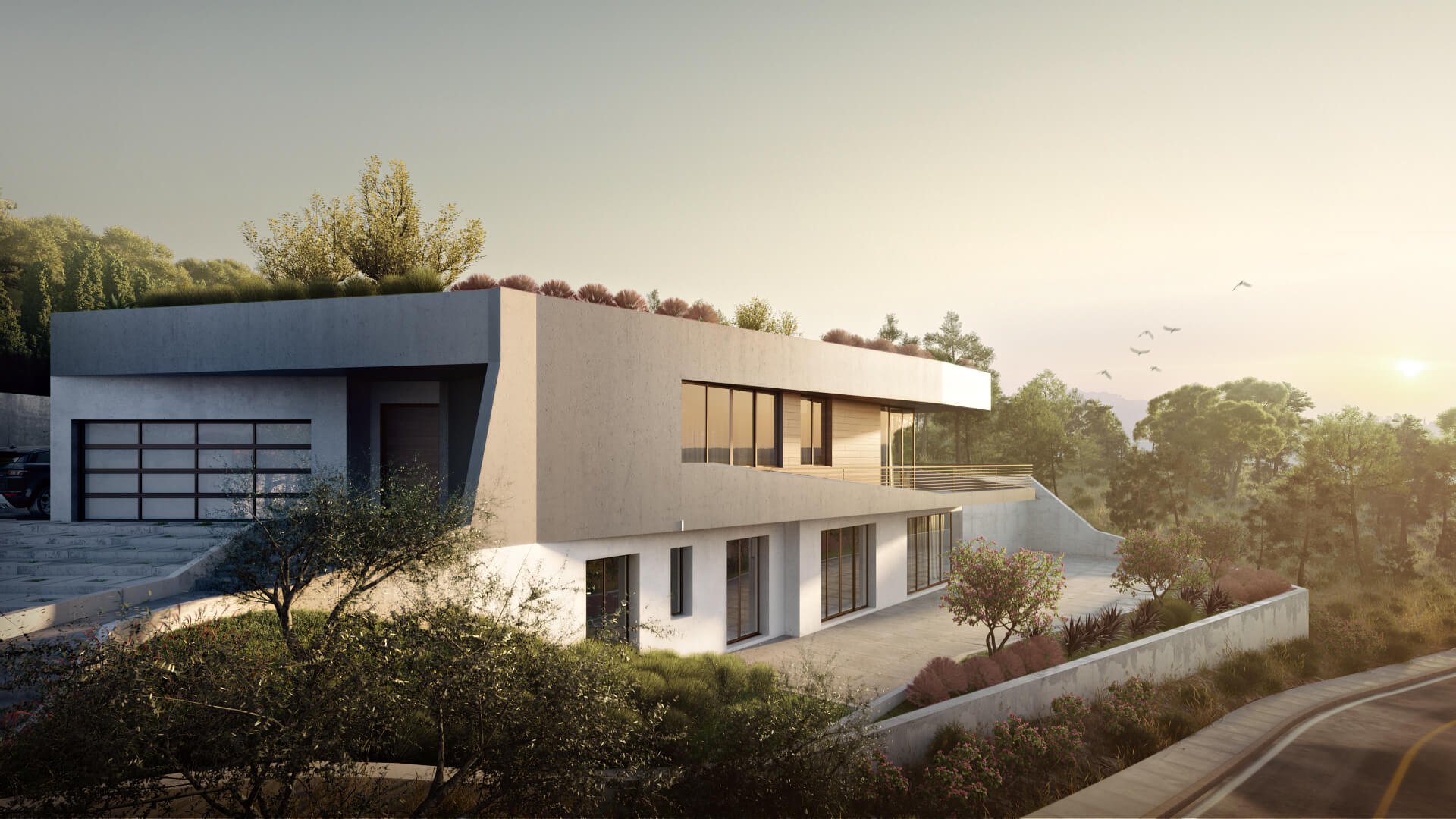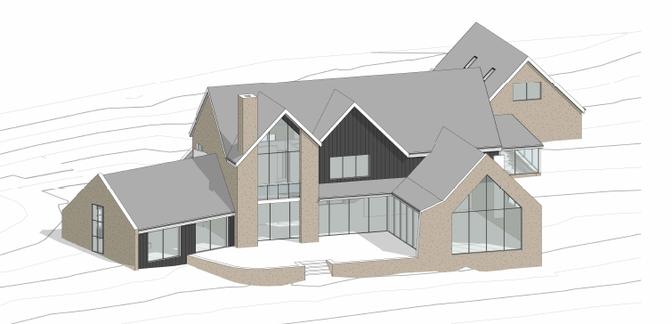 exterior shot exterior architecture with forest in backdrop and lots of landscaping and wild grass