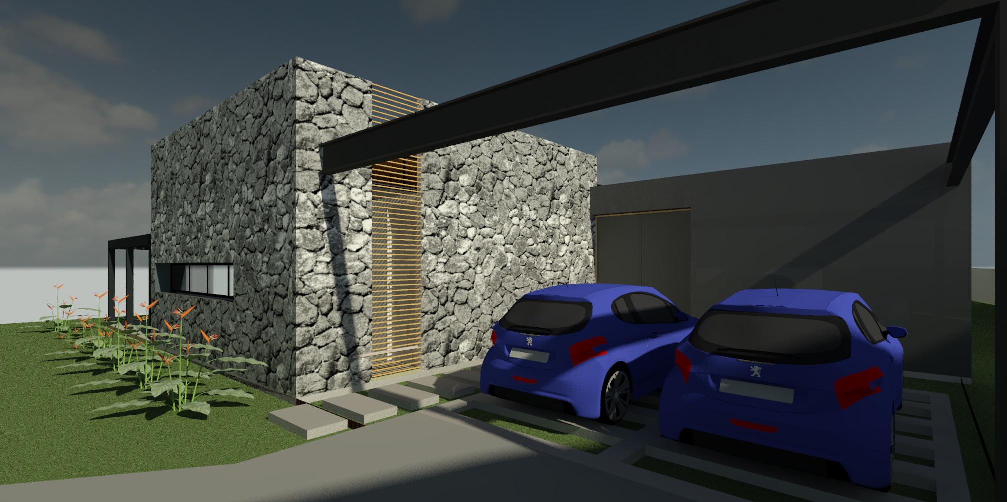 modernist interior shot camino de entrada con dos autos negros el camino de entrada en concreto delante de una casa que tiene un muro de piedra y una puerta de madera la casa tambi n tiene un exterior de piedra d ndole un aspecto robusto y elegante la escena se desarrolla en una zona residencial cielo azul architecture