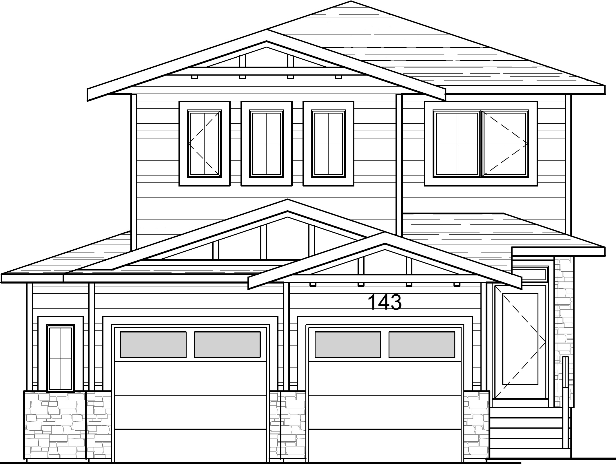 render this home using a combination of white and light grey exterior color tones the windows are to be white shingles dual grey fascias to be white garage doors to be white and front entry door the light grey color of the grey siding used place a ntural looking lighter grey stone where stone is shown on the plans also create the rendering with front yard landscaping inclusive of grass a d few shrubs and concrete front driveway
