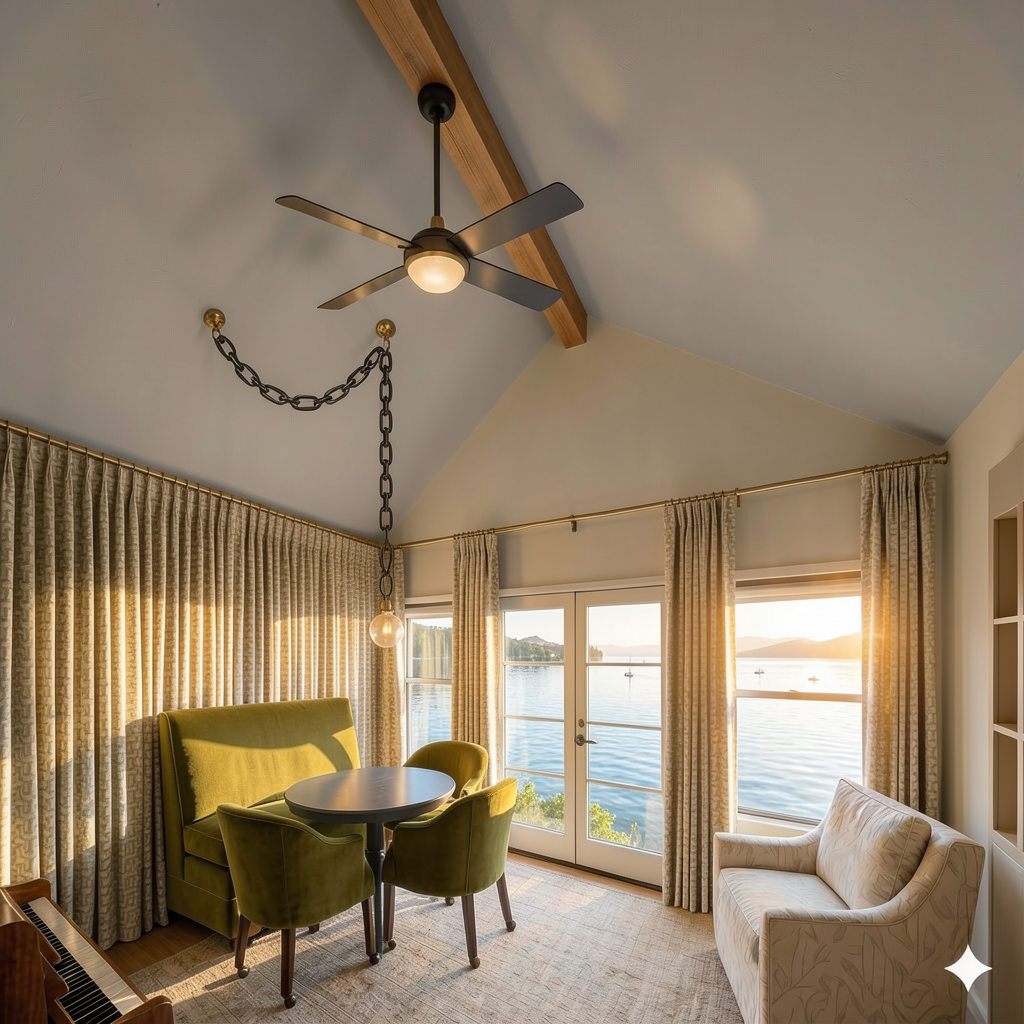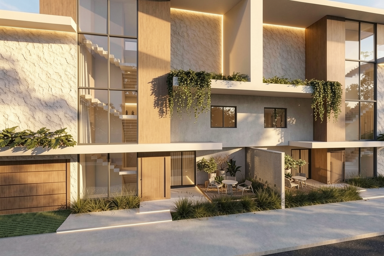 the site is located in the pacific palisades evening view lights on inside the house add california wild grasses and flowers to the landscape add grass in the the yard the spaces add some lights in the planting areas add a boy and girl playing with a dog in the yard add a woman sitting on the sofa outside and a man sitting across from her on the opposite sofa add trees on the adjacent properties like those seen in the pacific palisades add some pool balls on the table and pendant light above the table add some fire in the outdoor fireplace add a bottle of wine and two glasses of wine and some snacks on the table outside