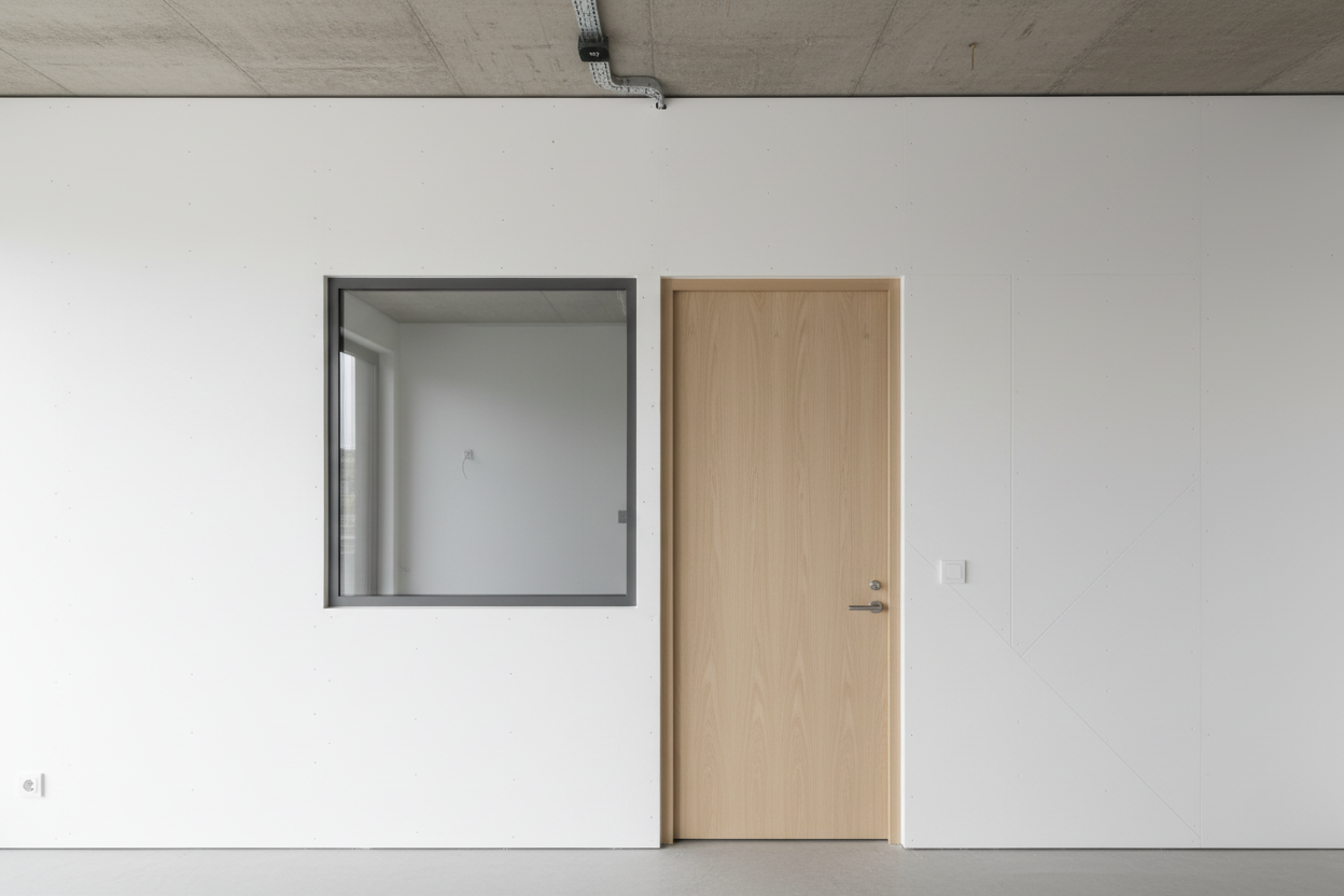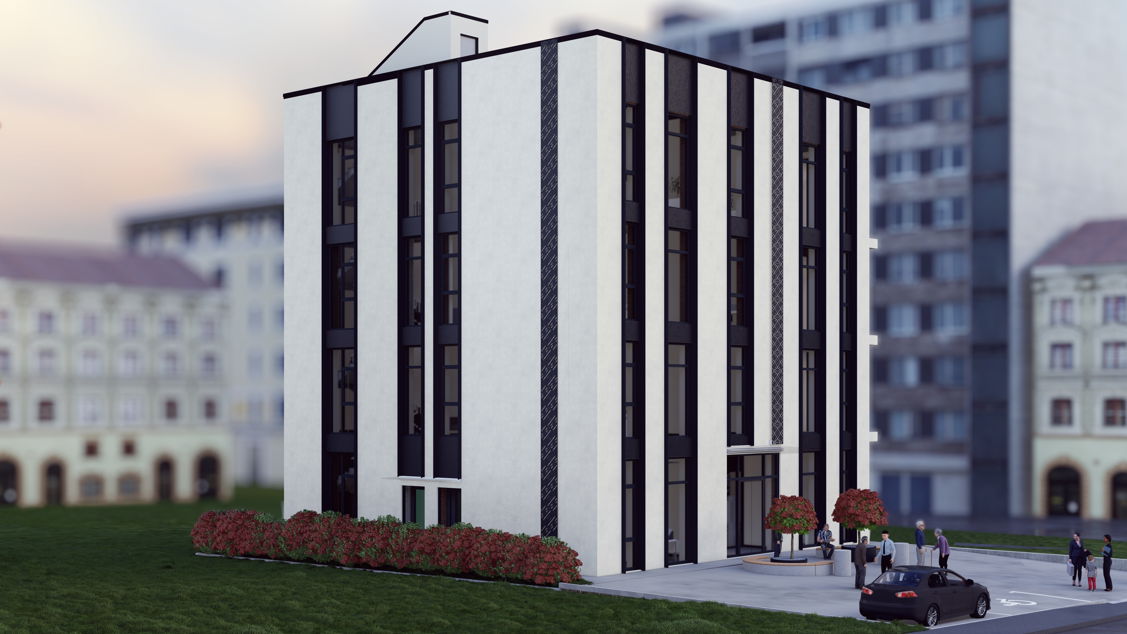 do not change any other details add interior lighting visible through the windows apply marazzi grande resin look bianco ceramic facade texture divide the facade into large ceramic panels with clean joints keep all the elements in the picture