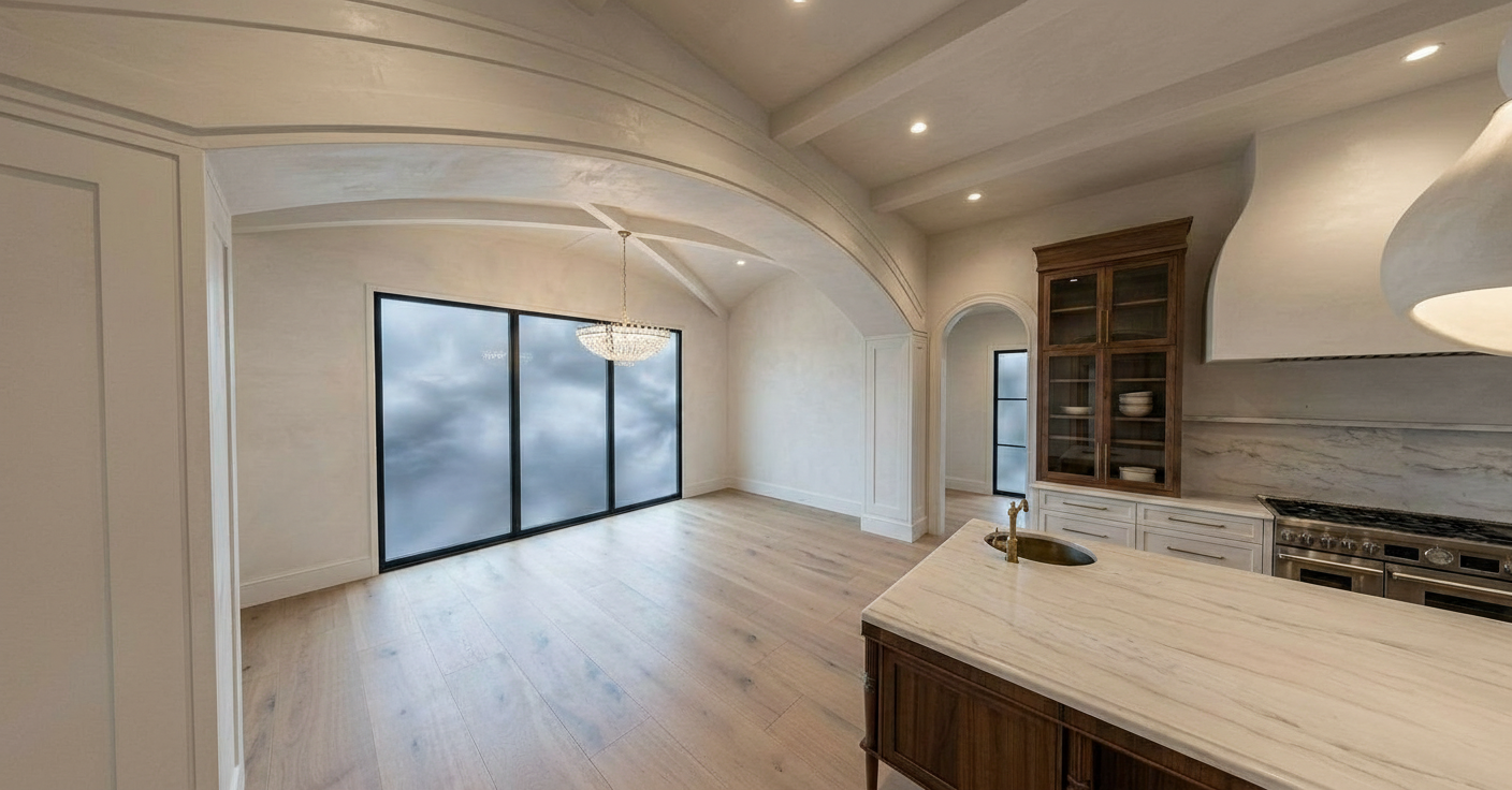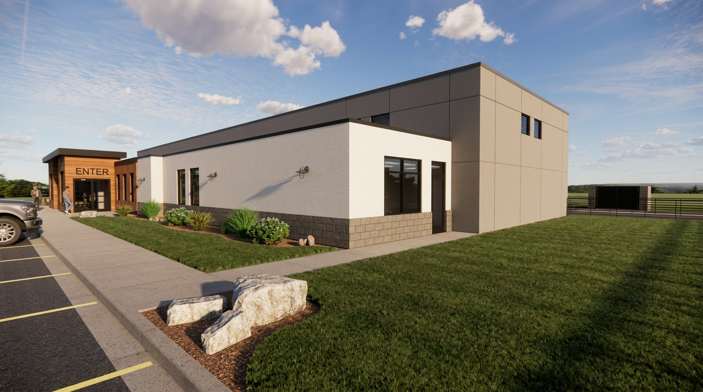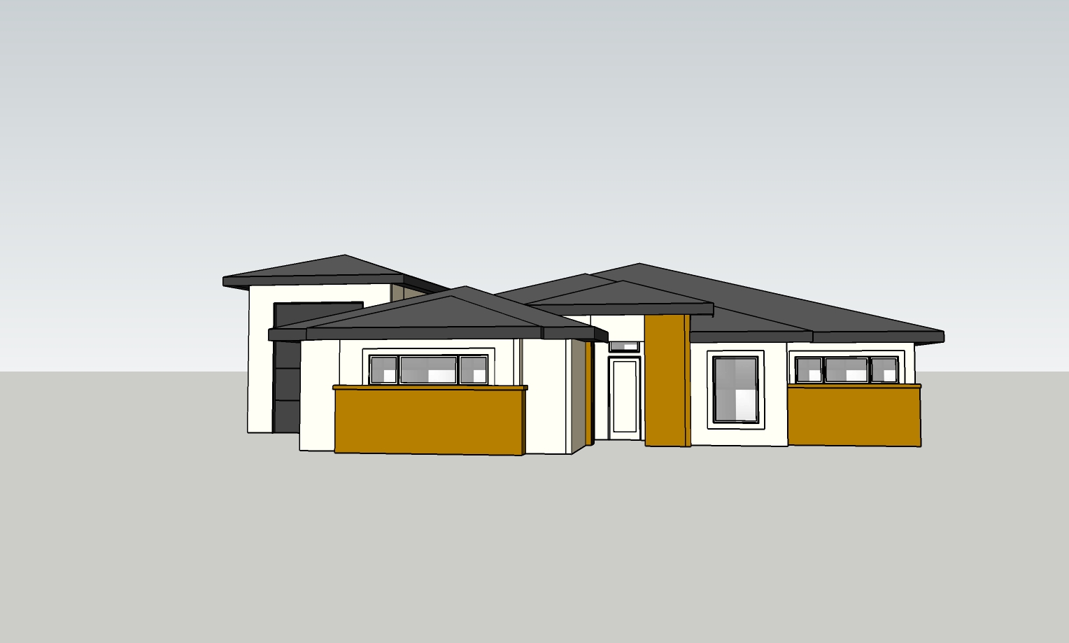 create a photorealistic rendering of the attached image using the other attached image as a guide for colors and materials keep all geometry the same add a background driveway and street