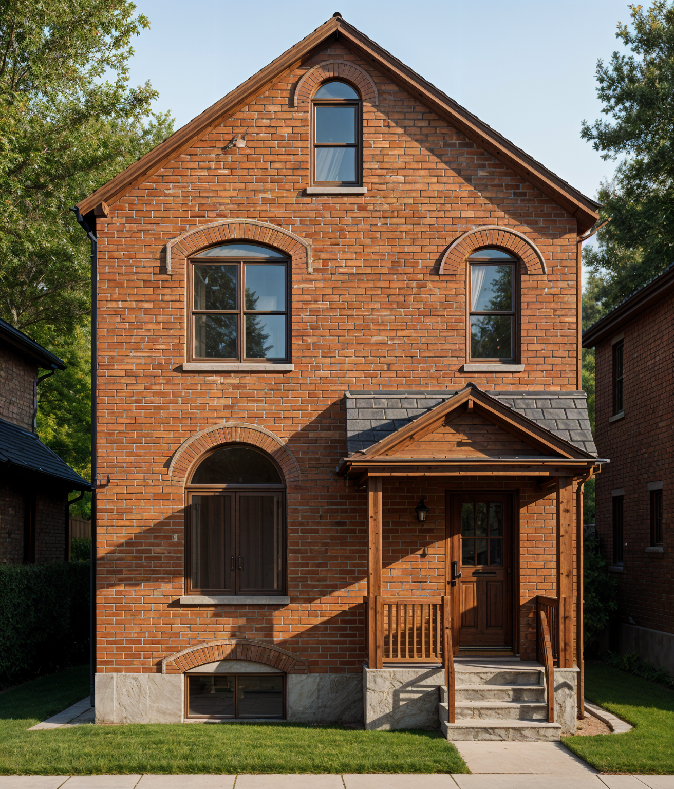 make a rendering of this house in hamilton ontario in a traditional style the porch is poured concrete with wood posts and shingle roof the brick is orange redish make it between two other brick houses too