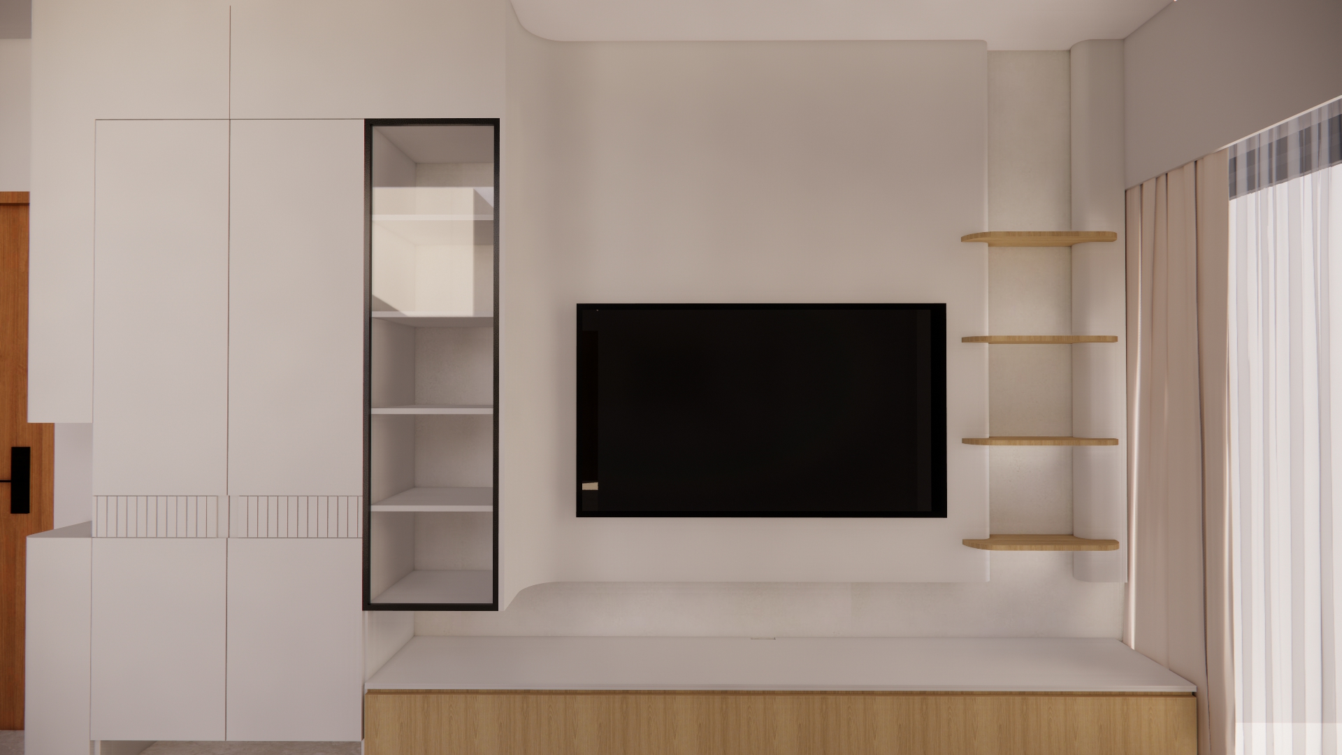 modern minimalist with natural lighting add striplight under tv wall add striplight vertical behind shelves add robot vacuum under the left side cabinet add minimalist accessories strictly retain colors