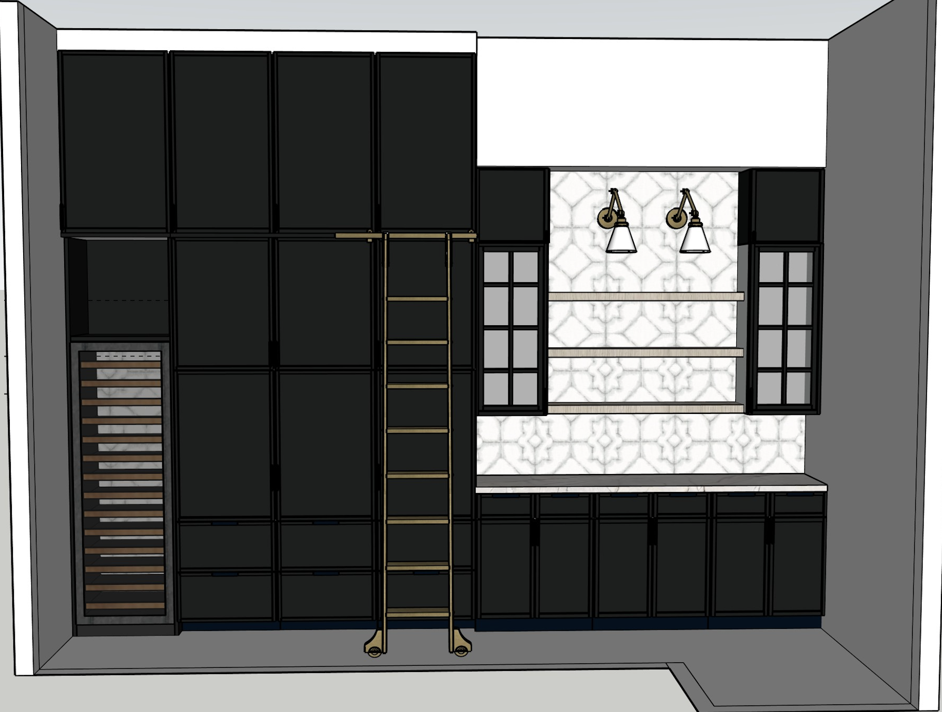 create a luxurious interior design rendering of a modern kitchen the space features sleek matte black cabinetry dominating the left side contrasted by a patterned white and gray tile backsplash filling the right side highlight the elegant gold accented ladder leaning against the cabinetry adding a touch of sophistication position two stylish brushed bronze sconces above the backsplash casting warm light include transparent glass paneled cabinets flanking the open shelving with light wood shelves for a touch of natural warmth the atmosphere is contemporary and refined utilizing a color palette of black white gray gold accents and subtle natural wood tones the lighting is soft and ambient enhancing the elegant and modern feel
