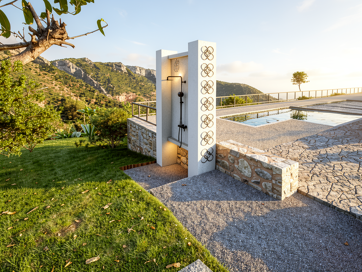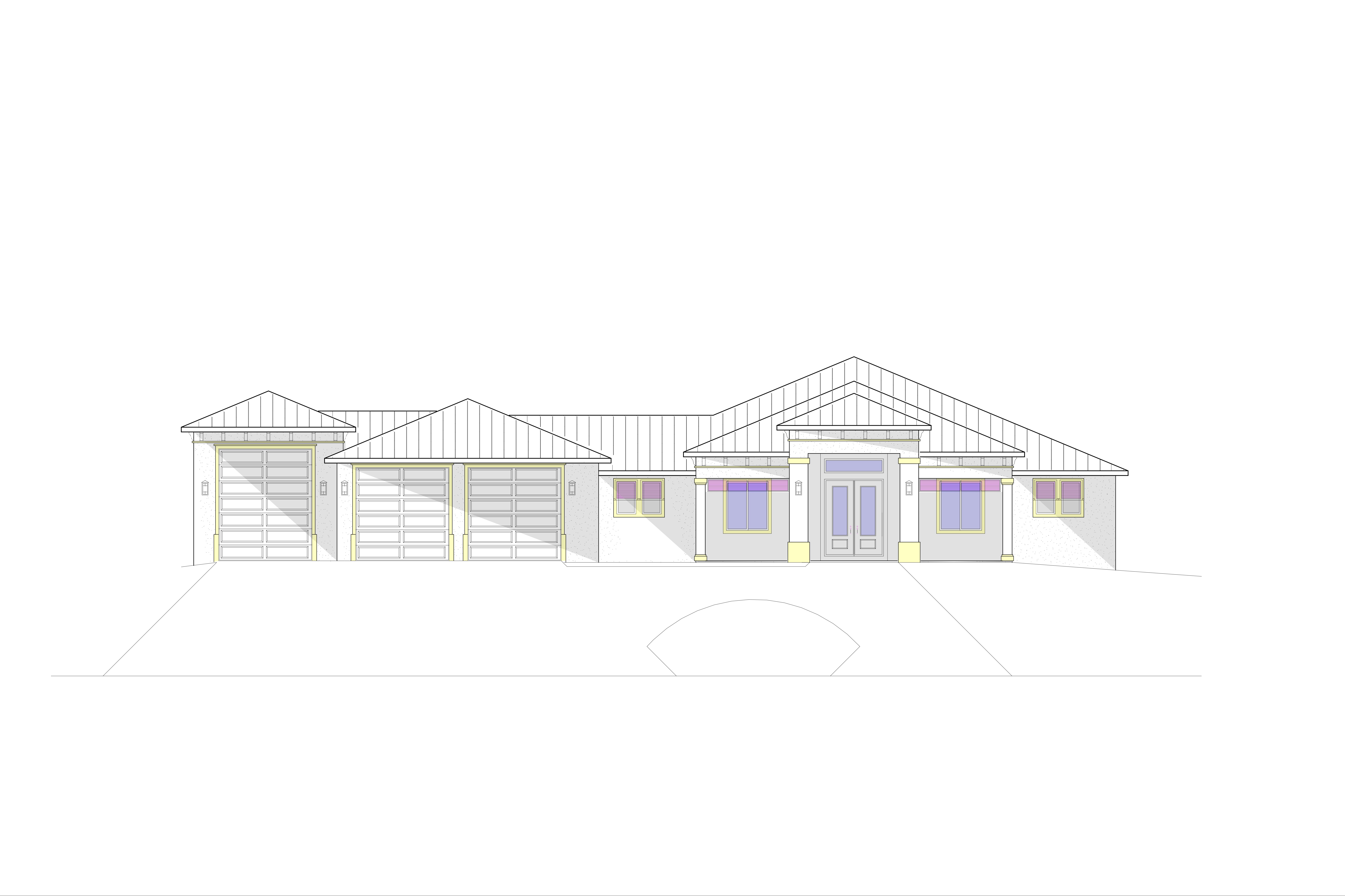 light gray standing seam metal roof light gray fascia and overhang white walls light gray banding light gray roof overhang corbles brown entry door brown garage doors white window frames white walls light blue bahama shutters white walls dappled gray circular driveway tropical landscaping entry columns 6 in front of house porches each side of entry 4 in front of house 2 garage doors 10 wide by 10 high 8 in front of house single garage door 10 wide by 12 high 7 behind garage with double doors window beside entry to have bahama shutters entry door to be single light french door