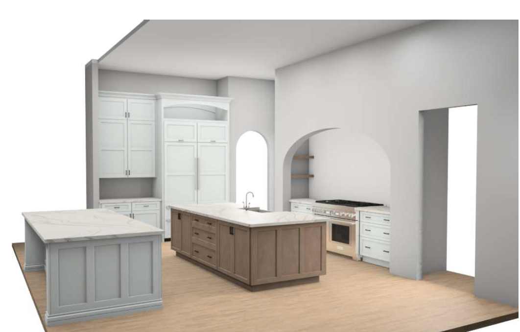 add a stacked stone surround only around the curved arch opening above the range the stone should follow the exact curve of the arch and be applied to the face of the arch only wrapping slightly into the thickness of the opening for depth do not apply stone to the wall behind the range or backsplash area do not extend the stone to the ceiling the wall surface behind the range should remain smooth and consistent with the surrounding wall finish use a natural warm toned stacked stone with subtle variation soft taupes creams and light grays to complement the white perimeter cabinetry and the warm wood island keep the texture refined and not overly rustic ensure the lighter cabinetry reads clearly as white in tone not gray maintain all existing cabinetry countertops layout and finishes exactly as shown do not alter the range arch size or surrounding walls only enhance the arch detail improve lighting contrast and material clarity for a high end realistic presentation