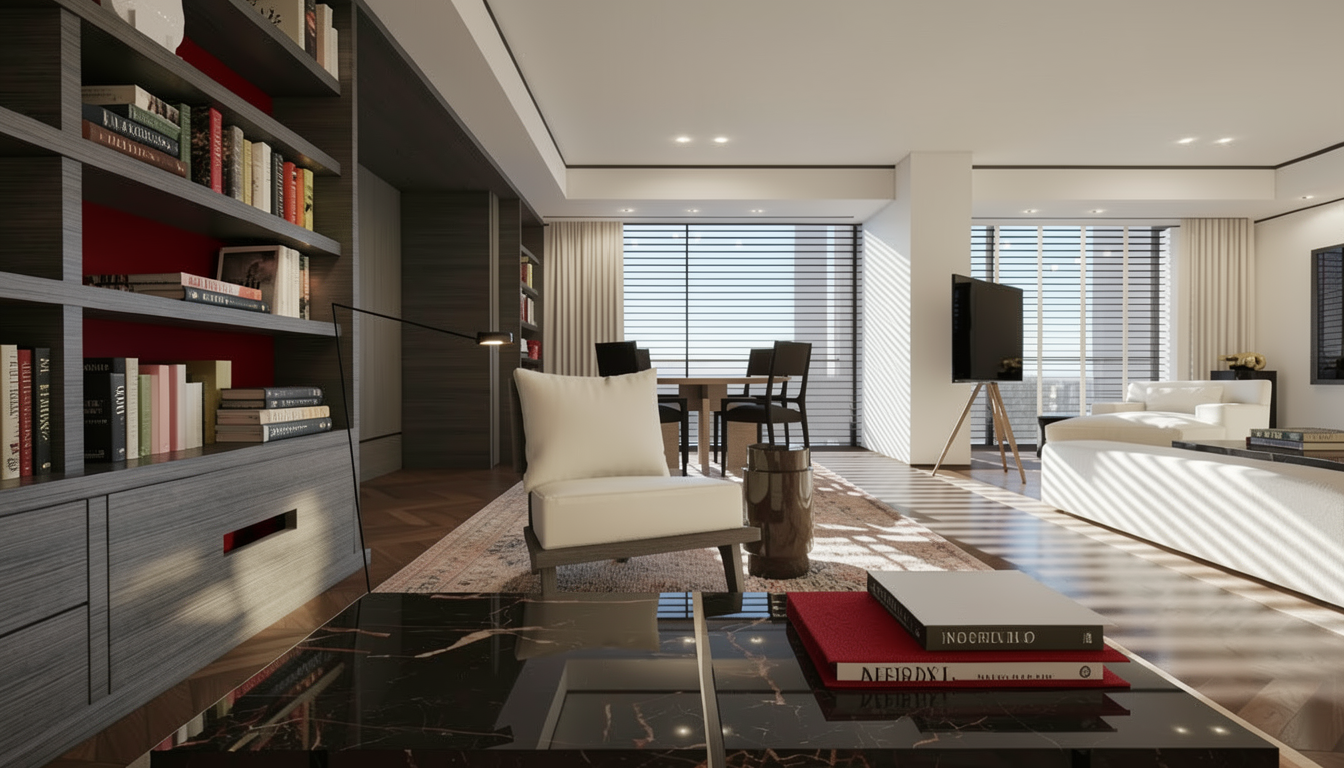 contemporary interior shot modern warm toilet room with sleek reflective tile pop of deep blue color architecture
