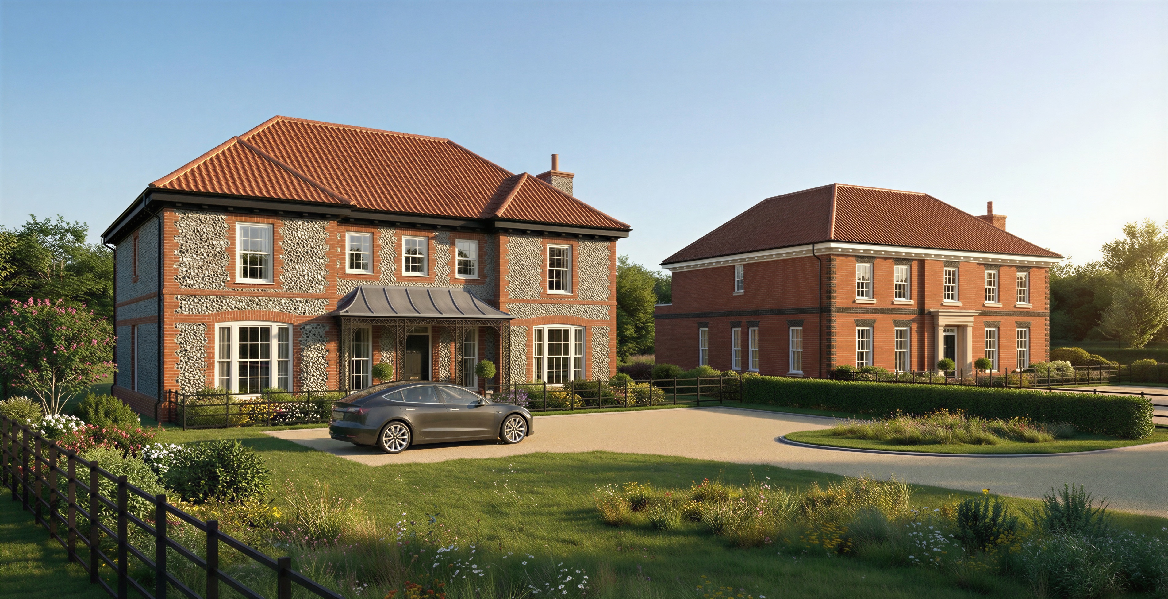 make the fence in the foreground an elegant slim black wrought iron post and rail fence make all roof tiles a flay red clay roof tile make the blaxk glazed brick on edge to the buildingnon the right less prominent or bold it needs to be present but more subtle add some wild lavender int he patch of grass between the buidligns