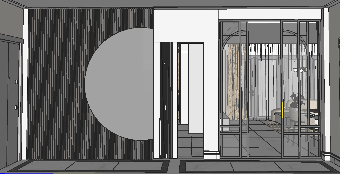 a house in soft beige tones the slats are cream colored the sliding door is white there s an led around the glass door led light is leaking from behind the round mirror the steel door is in anthracite tones