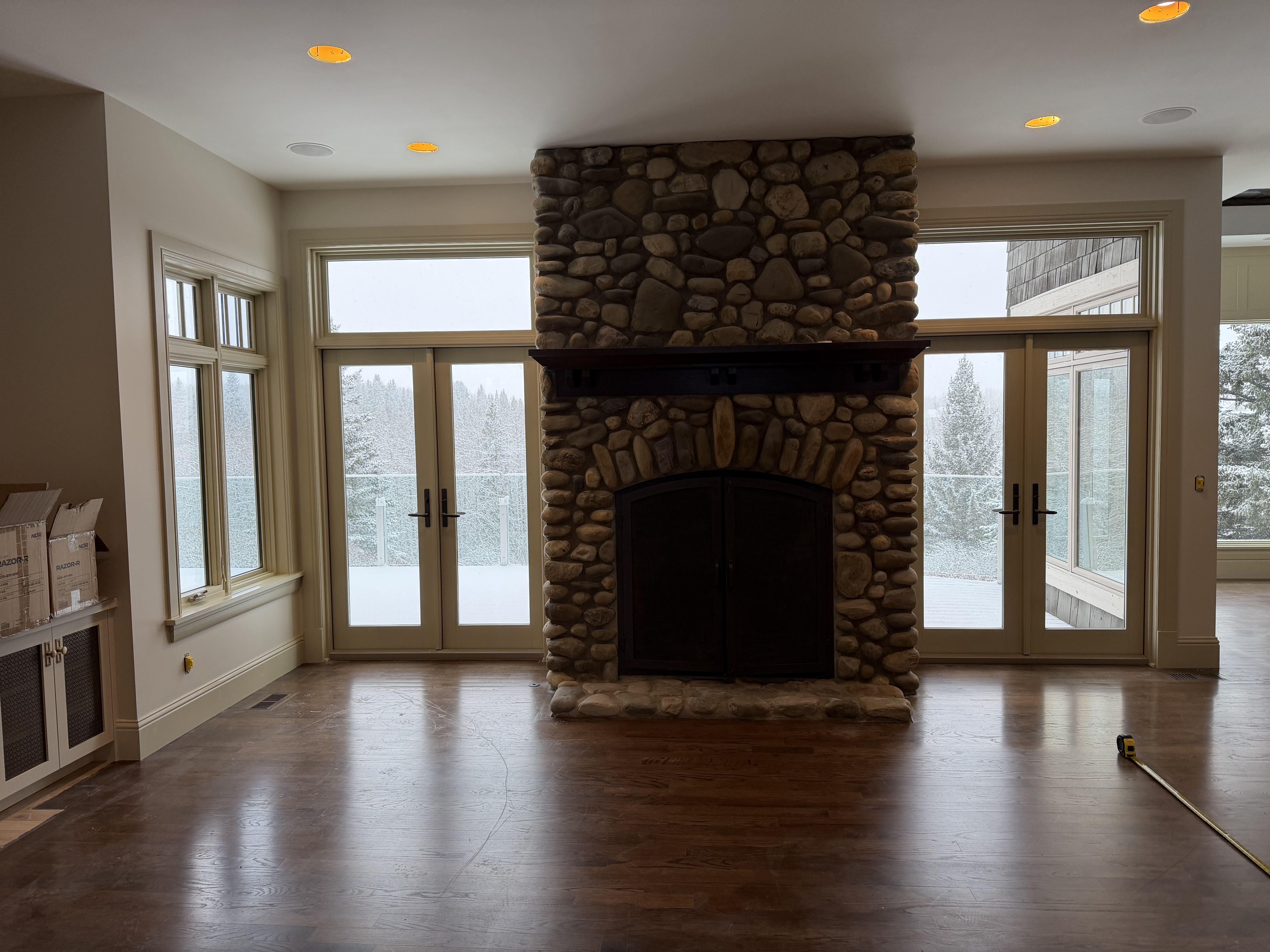 put a 7 foot olive tree in pottery base on left side of fireplace