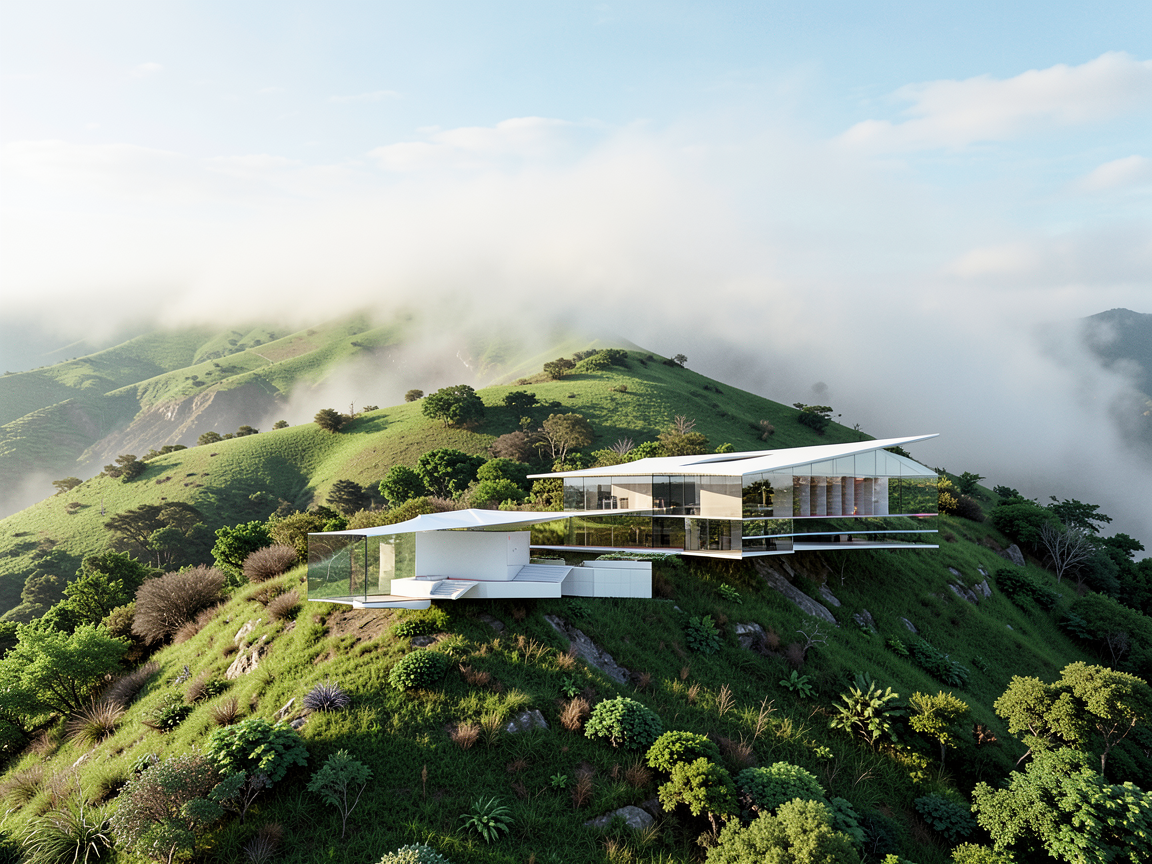 generisi mi render objekta koji je na slici belom bojom obojen tako da je svaki providni deo staklo i ne menjaj geometriju objekta dodaj staklo i u donjem objektu i da krov bude pod nagibom kao i visi objekat a i napravi brdo u kom se useca moj objekat i napravi ceo ambijent iza kao da je neka suma i zelenilo tako da se utapa sa brdom i napravi ga tako malo apstraktnim i da brdo bude apstraktno i da nema ivice da se ne vidi gde se dole zavrsava i da iza bude suma uvelicnana i da se ne vidi ovaj prazan prostor kaskade nego da gornji i donji deo objekta vire iz brda promeni mi pozadinu brda da bude uvelicano i apstraktno ijednostavno da izgleda minimalisticki skloni maglu da bude cisto nebo i iza brda da bude suma koja je direktno iza i pored objekta a brdo napravi jednostavnije i ilustrovano bez vegetacije
