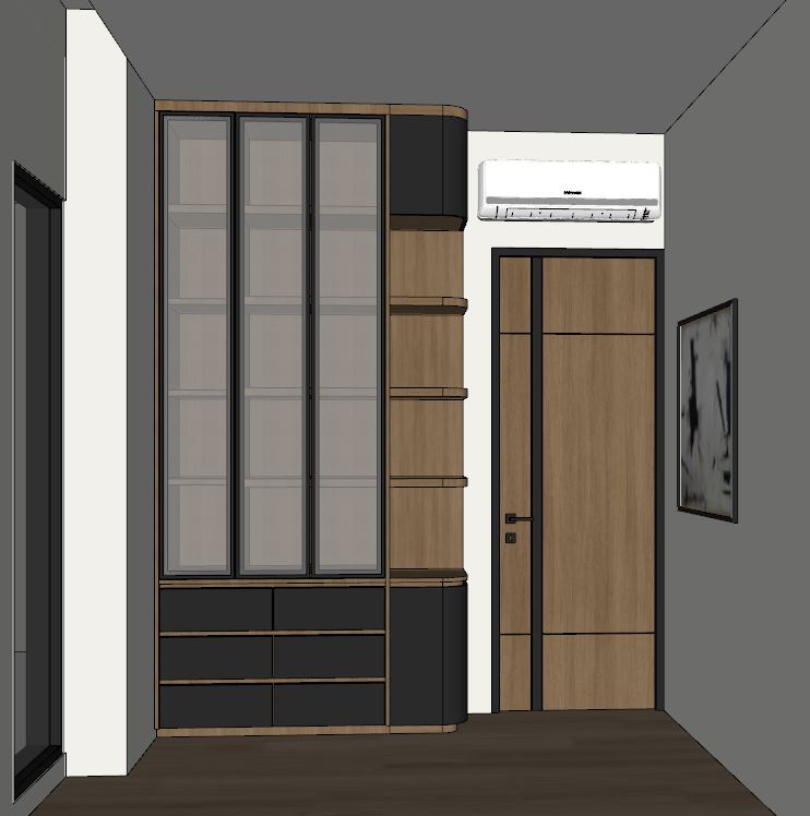 create ultra realistic images without changing any structure shape design or material do not resize the jpeg do not change the color of material use soft wood texture for the floor and add indirect light to the shelves and add decorations and use light beige color for wall paint add indirect light to the curtain valance