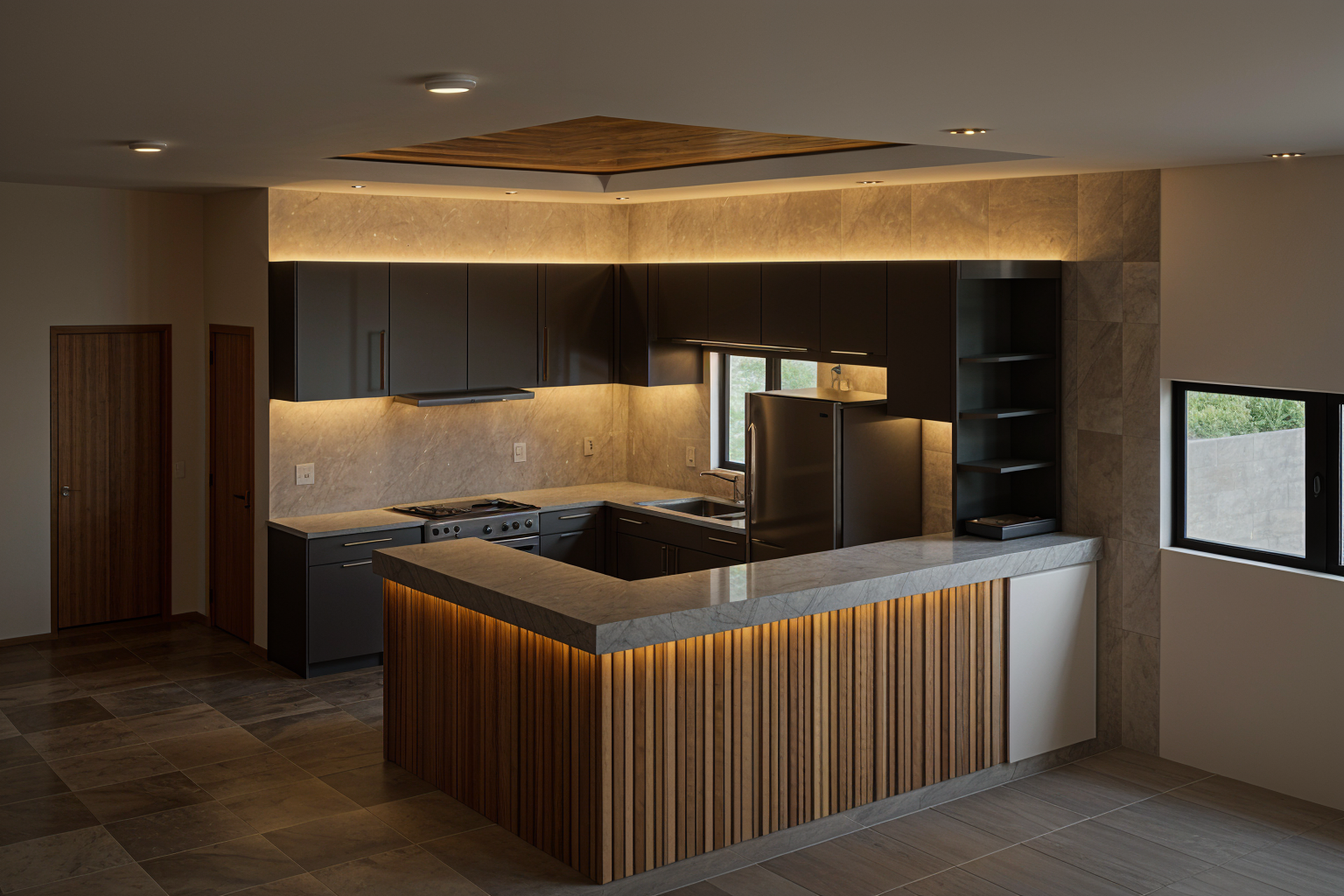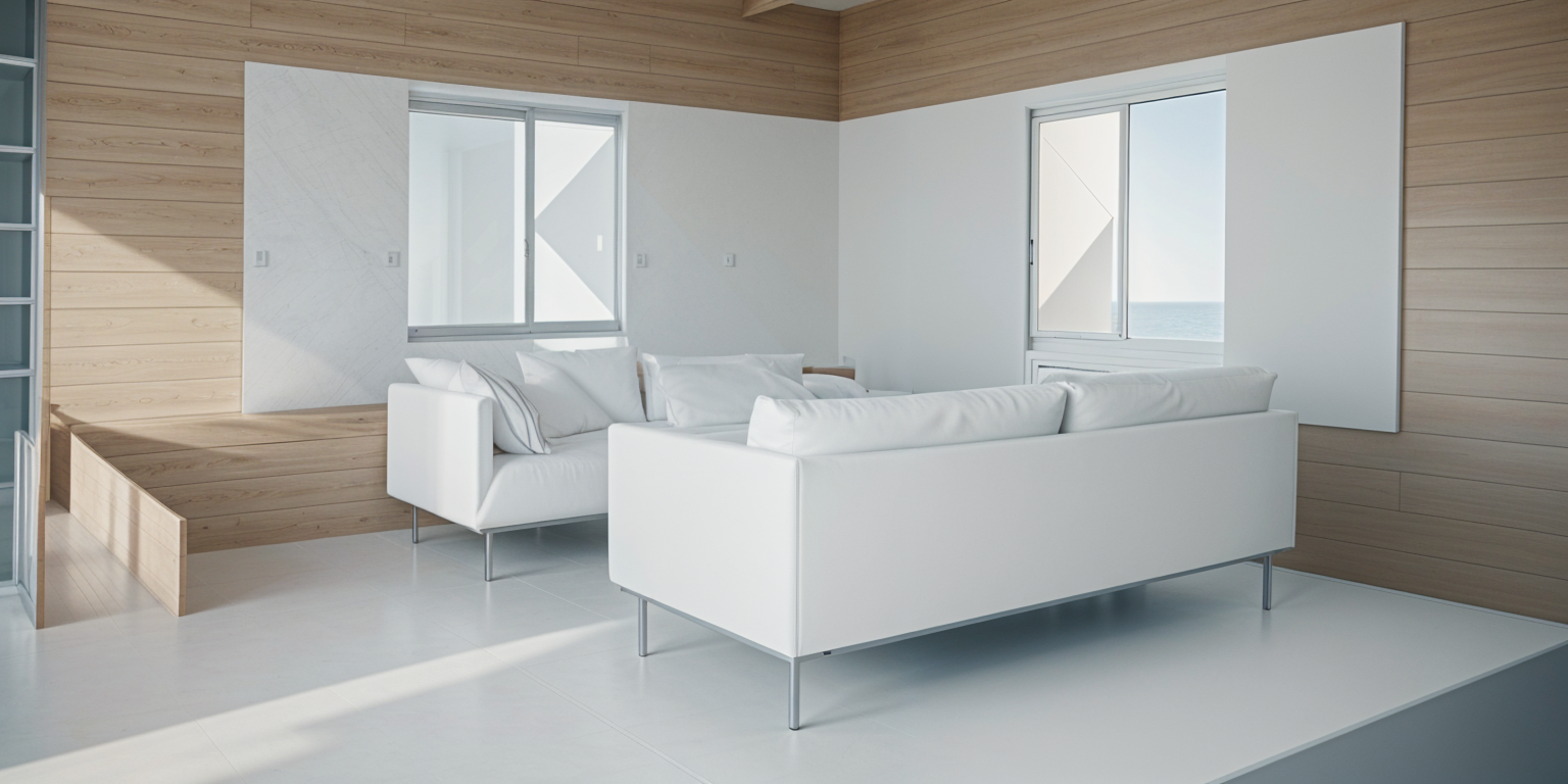 exterior shot a modern living room with a cozy atmosphere the walls are a soft beige with a hint of texture complemented by a sleek white marble fireplace on the right side the fireplace emits a warm orange flame creating a welcoming glow a flat screen tv is mounted above a minimalistic floating shelf in dark wood and white the large windows are adorned with floor to ceiling light beige curtains that frame sheer blue drapes allowing gentle sunlight to filter through a contemporary soft brown sectional sofa sits to the left providing a comfortable seating area a round coffee table in dark wood sits in front with a decorative white vase and black twigs accented with cozy elements this room embodies elegance and tranquility architecture