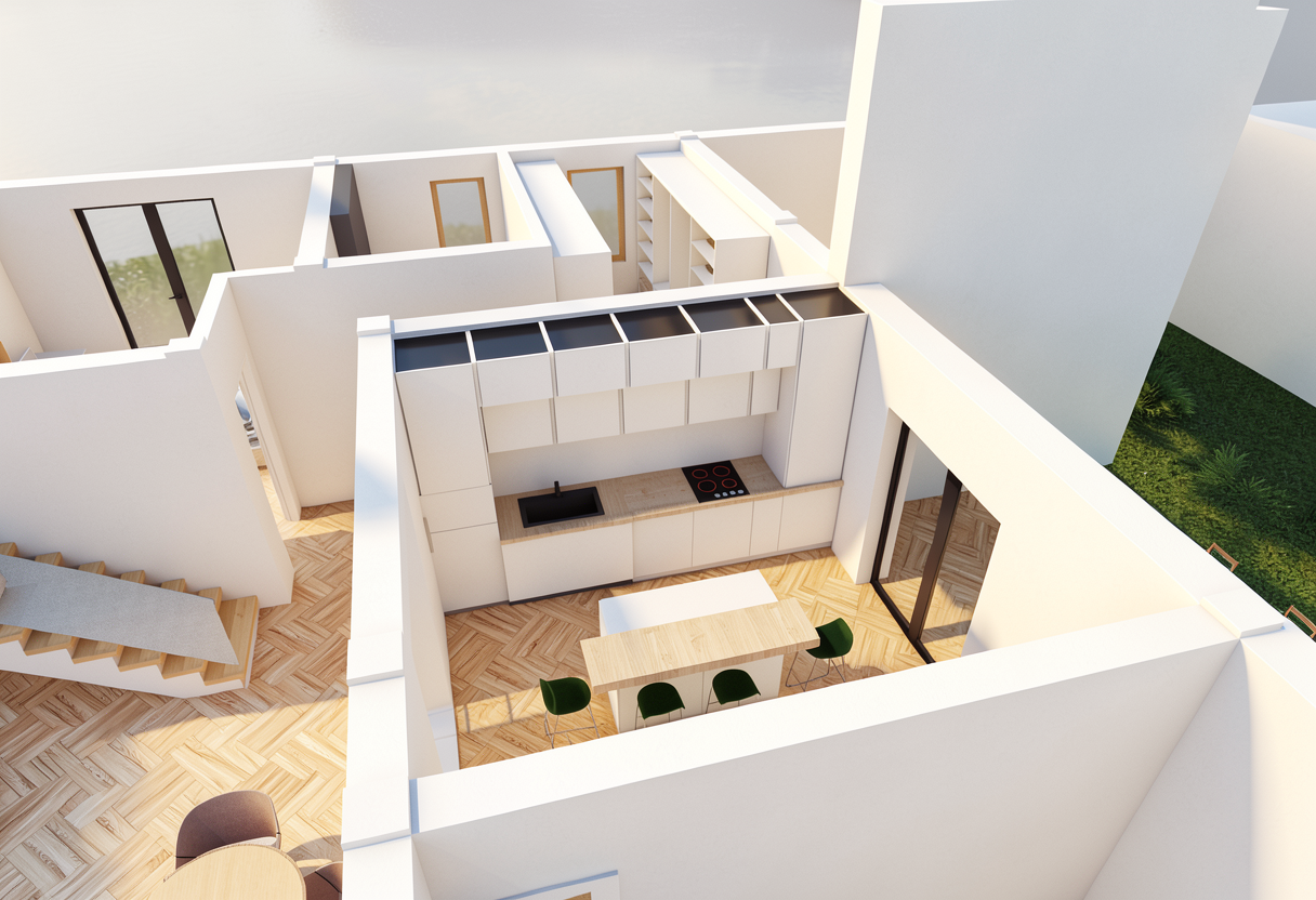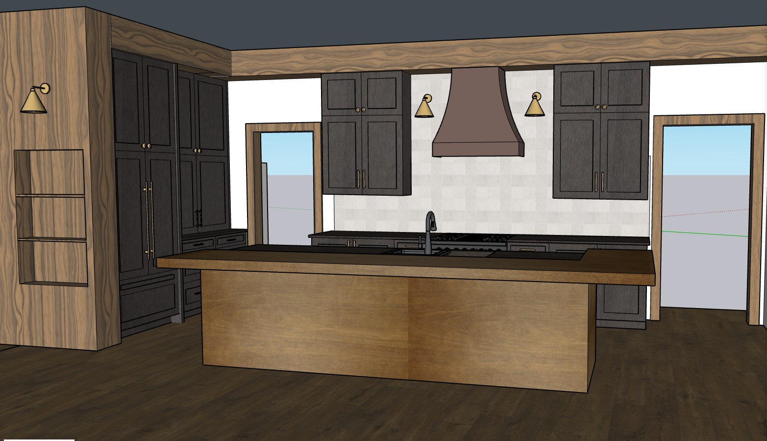 photorealistic render of a custom kitchen interior maintain original design and colors exactly do not alter color palette perimeter cabinetry is dark stained wood almost black with visible natural wood grain and a soft satin finish not painted not flat cabinet hardware is brushed brass handles and knobs kitchen island is a warm medium caramel stained wood with visible grain and a satin finish island and perimeter countertops match exactly in material and color range hood is brushed antique copper with a soft aged patina not polished not shiny wall sconces on either side of the hood are brass with a warm brushed finish lighting is warm 2700k 3000k a continuous wood soffit architectural band runs along the top of the cabinetry in an antique wood tone with subtle aging doorways are pocket doors with trim that matches the surrounding wood tones the tile is really creamt and hand made make it feel farm house like use realistic natural lighting soft shadows and accurate material reflections emphasize wood grain texture and depth and subtle metal reflectivity avoid overexposure avoid high gloss finishes and do not change or reinterpret any colors