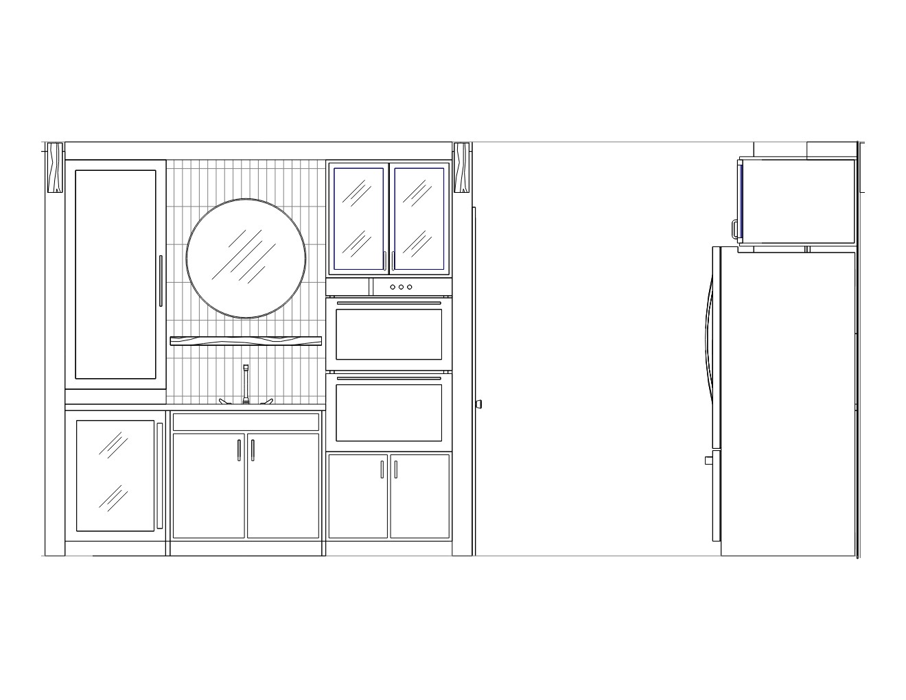 use a textured hunter green vertical tile with a bronze accent round mirror and cabinetry to be a dark sage green with earth tones have the two beams be a rustic wood and the shelf below the mirror to be a dark knotty wood render a minifridge to the left of the sink and glass cabinets above the double wall oven that is stainless steel make a warm light coming from the ceiling illuminating the mirror the stainless steel sink and warm wood shelf