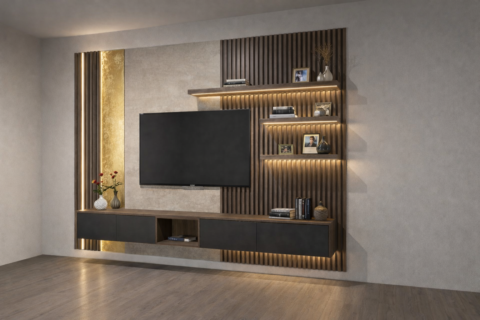 modulaci n tv sal n con espejo vertical dorado a la izquierda del tv