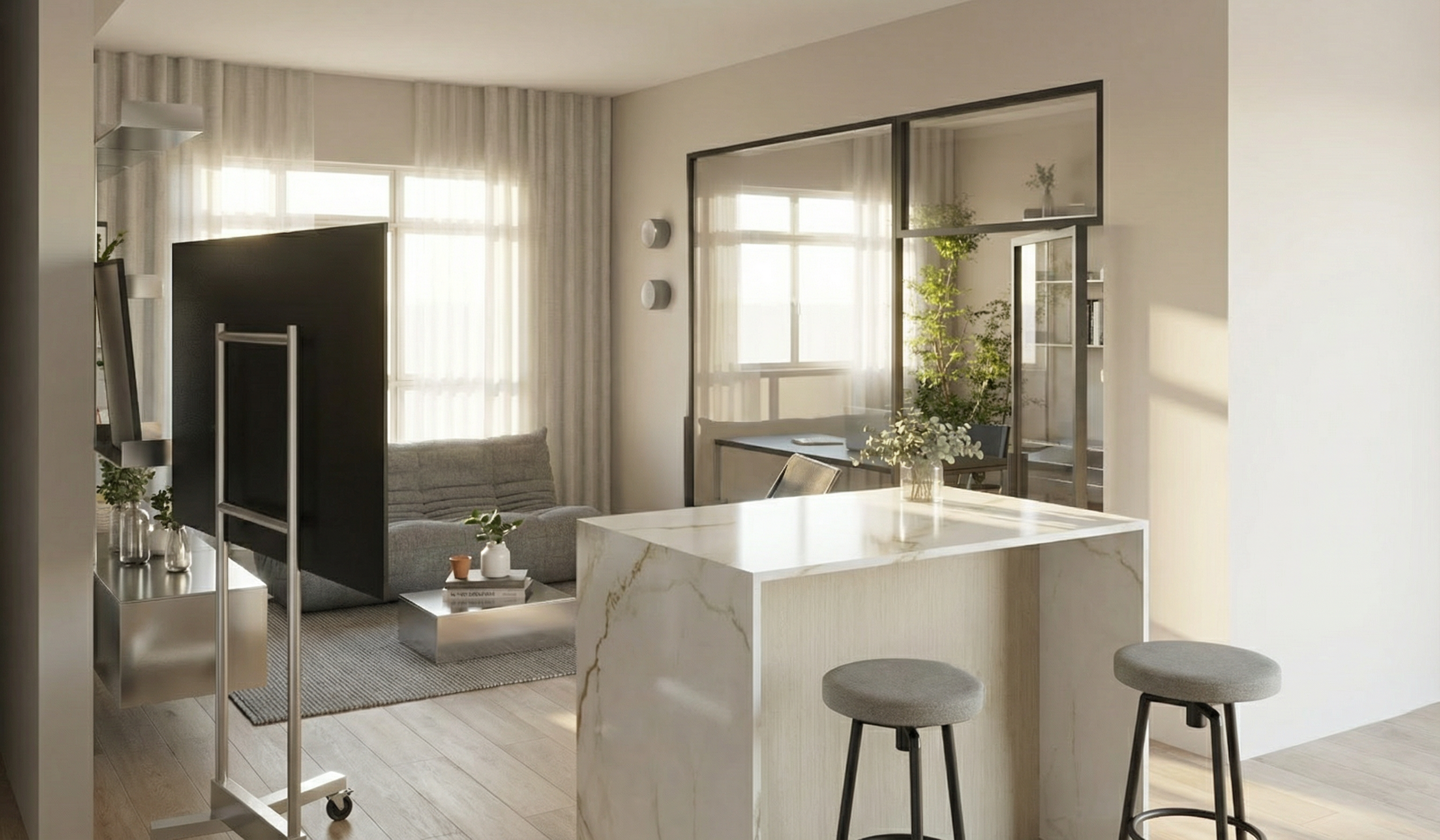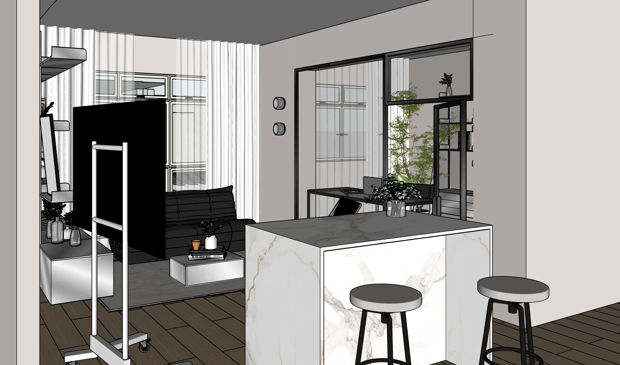 colours and texture to remain accurate as per original picture bar counter top in white gold marble leg support open shelving in stainless steel coffee table in stainless steel flooring in light wood grains subtle grains 2 pendant light