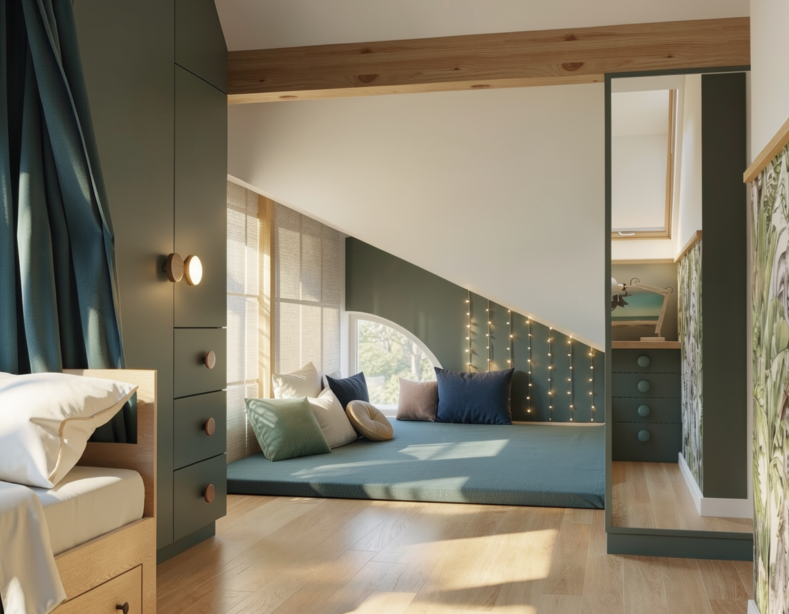 furniture in a light beige tone subtle led lightng oak wooden flooring