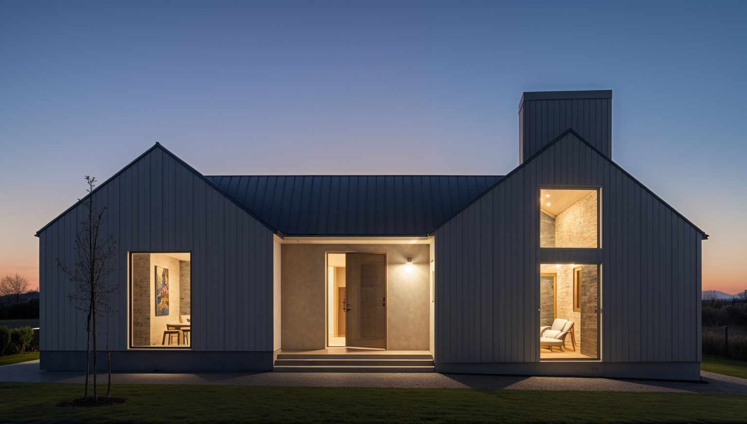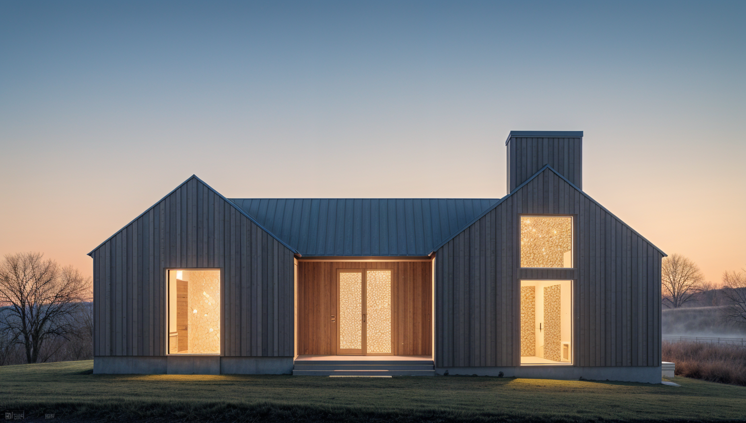 prairie style exterior shot country house vertical white cladding grey roof garage door to be timber grassy meadow flower foreground architecture