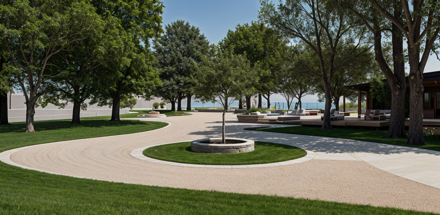 make this picture very realistic instead of the green area put there park grass instead of the paving there should be compact gravel material do not put the grass in the green circle there shoul be walkable wooden platform with tree in the middle in the background there is road with cars and buildings add there some people to make it more real