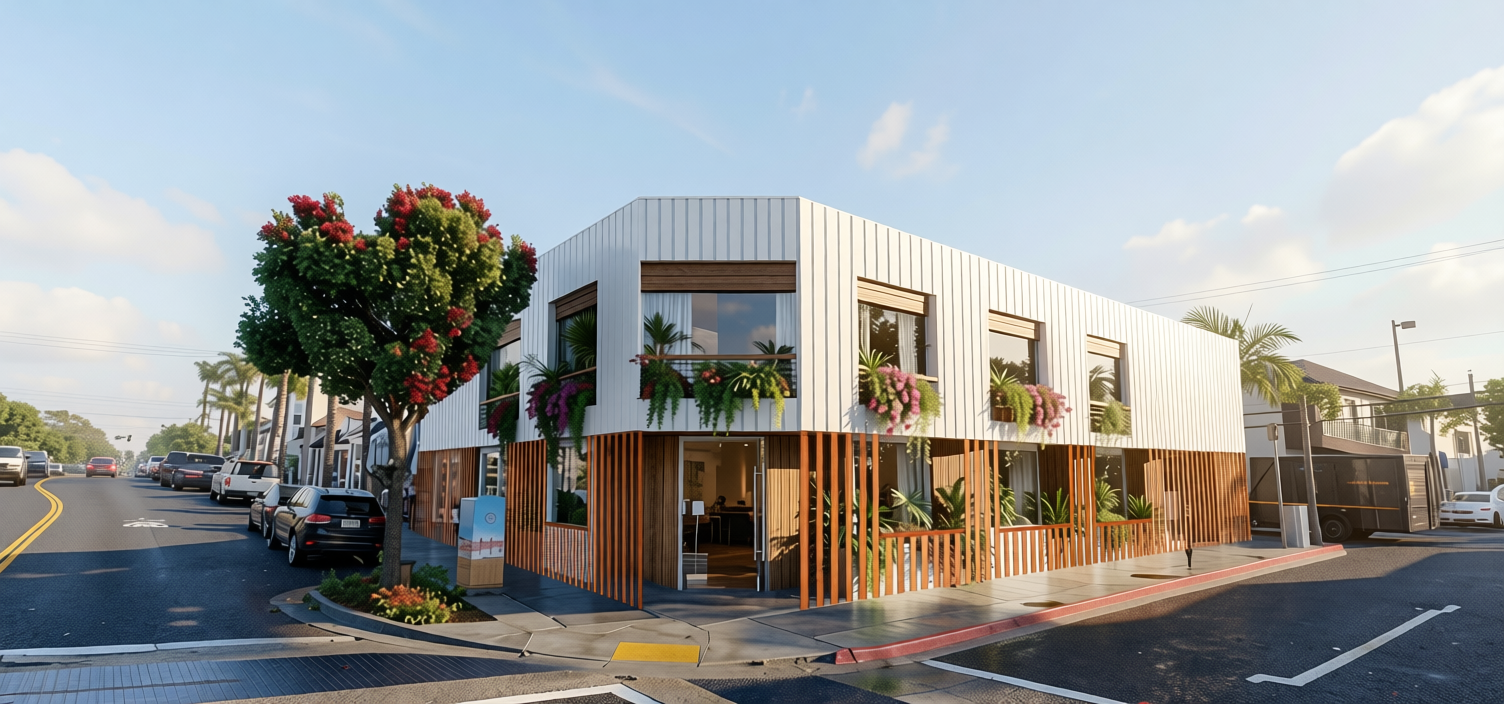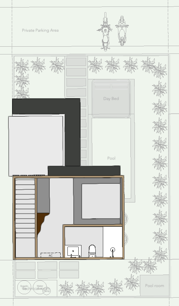enhance this architectural floor plan top down plan view by improving materials textures shadows and graphic clarity while strictly keeping the image as a 2d architectural floor plan drawing style requirement very important this must remain a top down architectural floor plan not a perspective render do not convert the image into a 3d render or interior perspective maintain the plan view architectural presentation style only improve materials textures subtle shadows and graphic clarity the result should look like a high end real estate architectural floor plan with realistic materials not a sketch or a 3d rendering layout and geometry preservation do not modify the layout walls furniture positions or proportions do not mirror rotate flip or reinterpret any element of the plan the orientation of the plan must remain exactly the same as in the original image all architectural elements must remain exactly where they are dimensions and text preservation all dimensions numbers and annotations must remain exactly as they appear do not recreate rotate mirror flip or redraw any numbers numbers must remain perfectly readable and in the same orientation as the original image do not remove reinterpret or adjust any measurement text stair orientation lock the staircase must remain exactly in the same position and orientation as the original plan do not flip mirror or rotate the stairs the direction of the steps must remain identical to the original drawing only enhance the material texture of the stairs material matte light concrete same tone as the floor materials main floor surfaces matte light concrete with warm neutral tones furniture soft areas beige warm grey tones with subtle material texture roof visible from lower floor black standing seam metal sheet roofing strict object preservation do not change the shape of furniture or architectural elements all objects must keep their original geometry and dimensions do not reinterpret any element of the plan goal improve material realism textures and subtle architectural shadows while preserving the exact architectural plan drawing no layout changes no object reinterpretation no perspective rendering no geometry modifications no flipped elements no rotated numbers