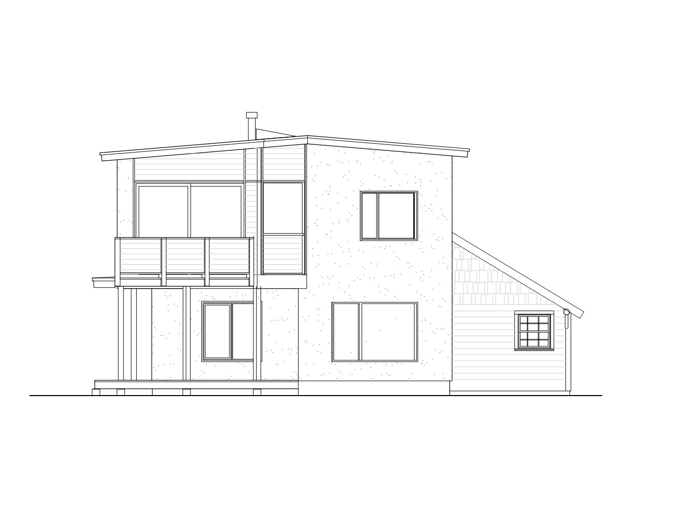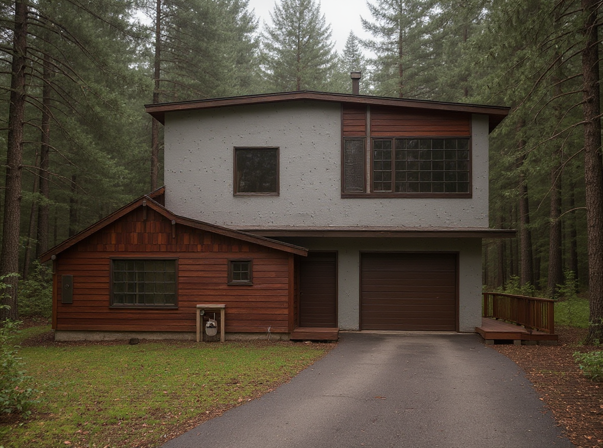 the stucco should have smooth finish and should have cement grey color the horizontal siding should be redwood siding the shake shingles at the gable should be redwood also the window frames should have dark bronze finish the background should be fir trees maintain all lines do not replace or add new lines