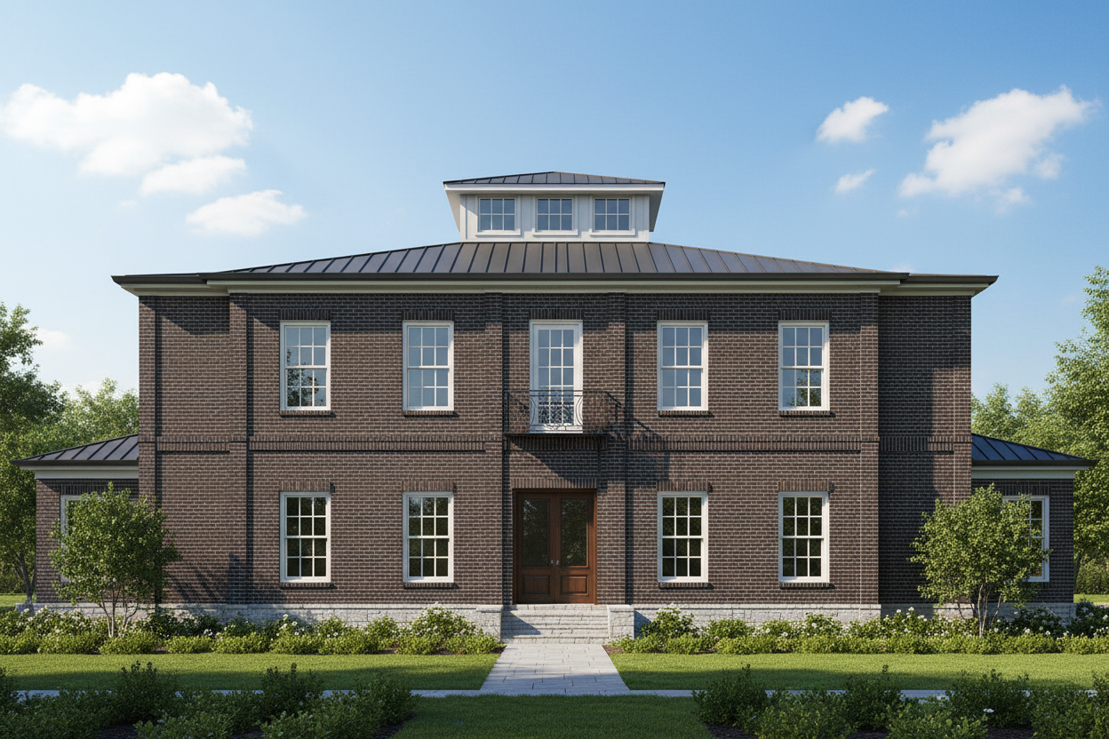 night time add back lighting behind all red and silver horizontal bands on the front and right side of building