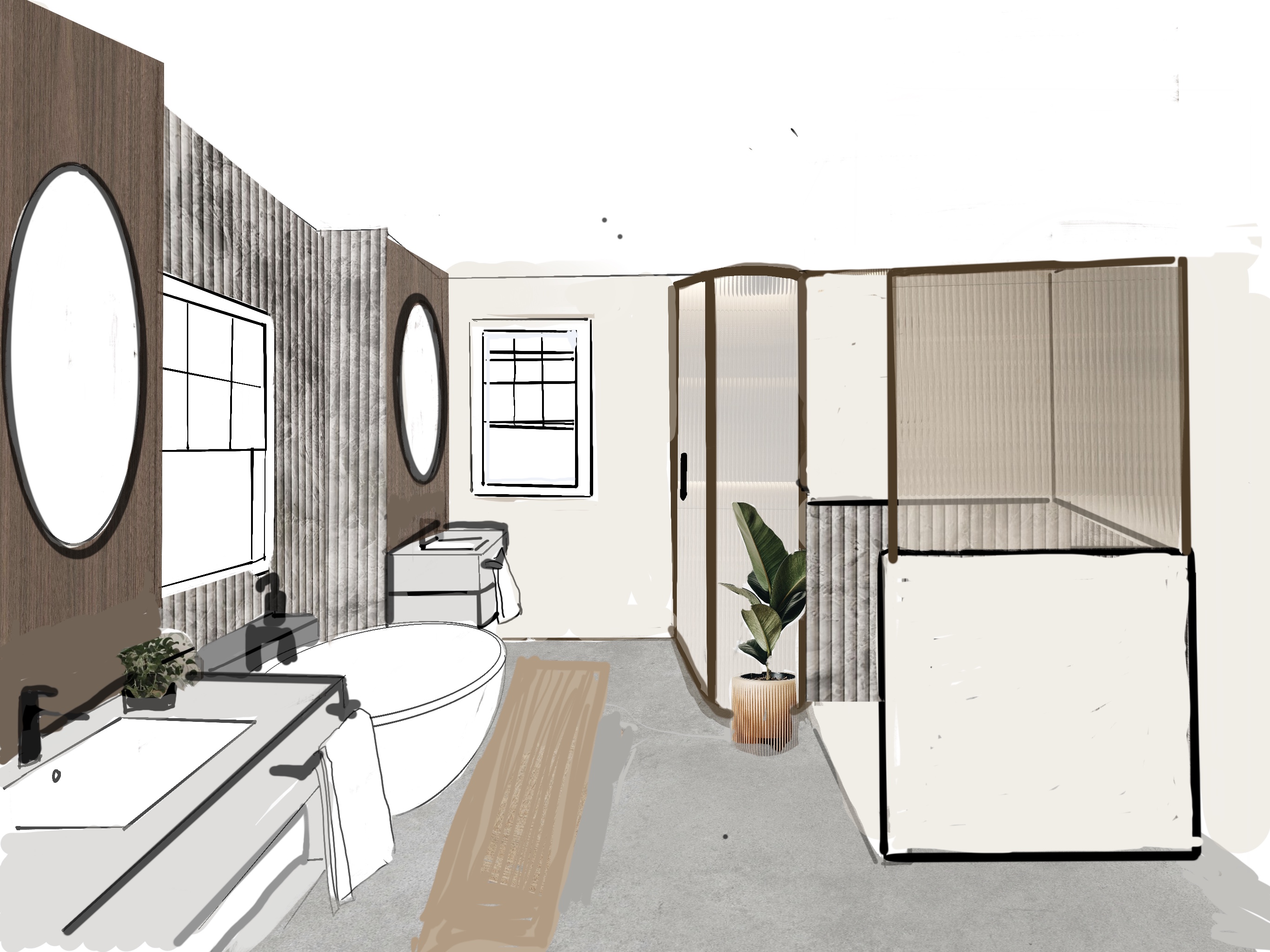 concrete sinks walnut vaneer behind sinks full wall