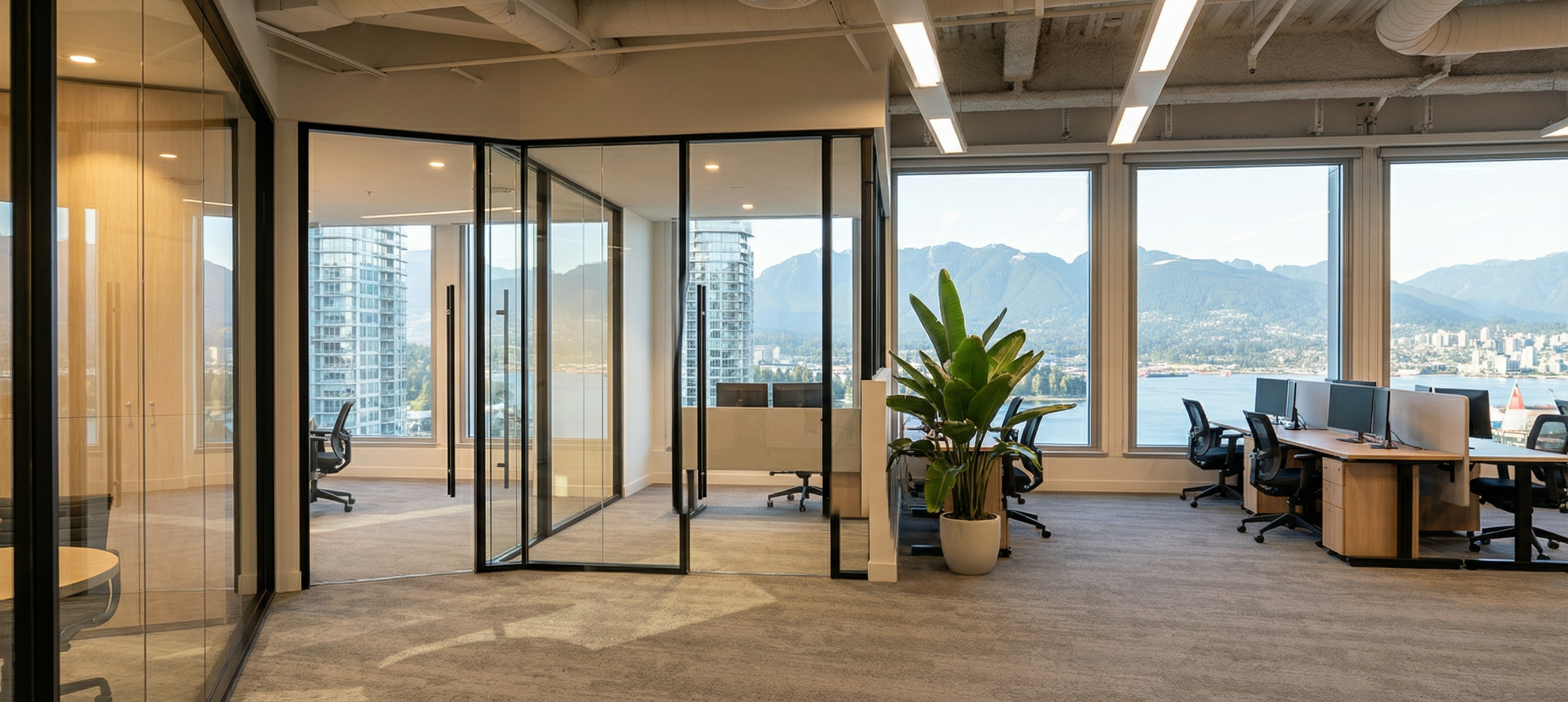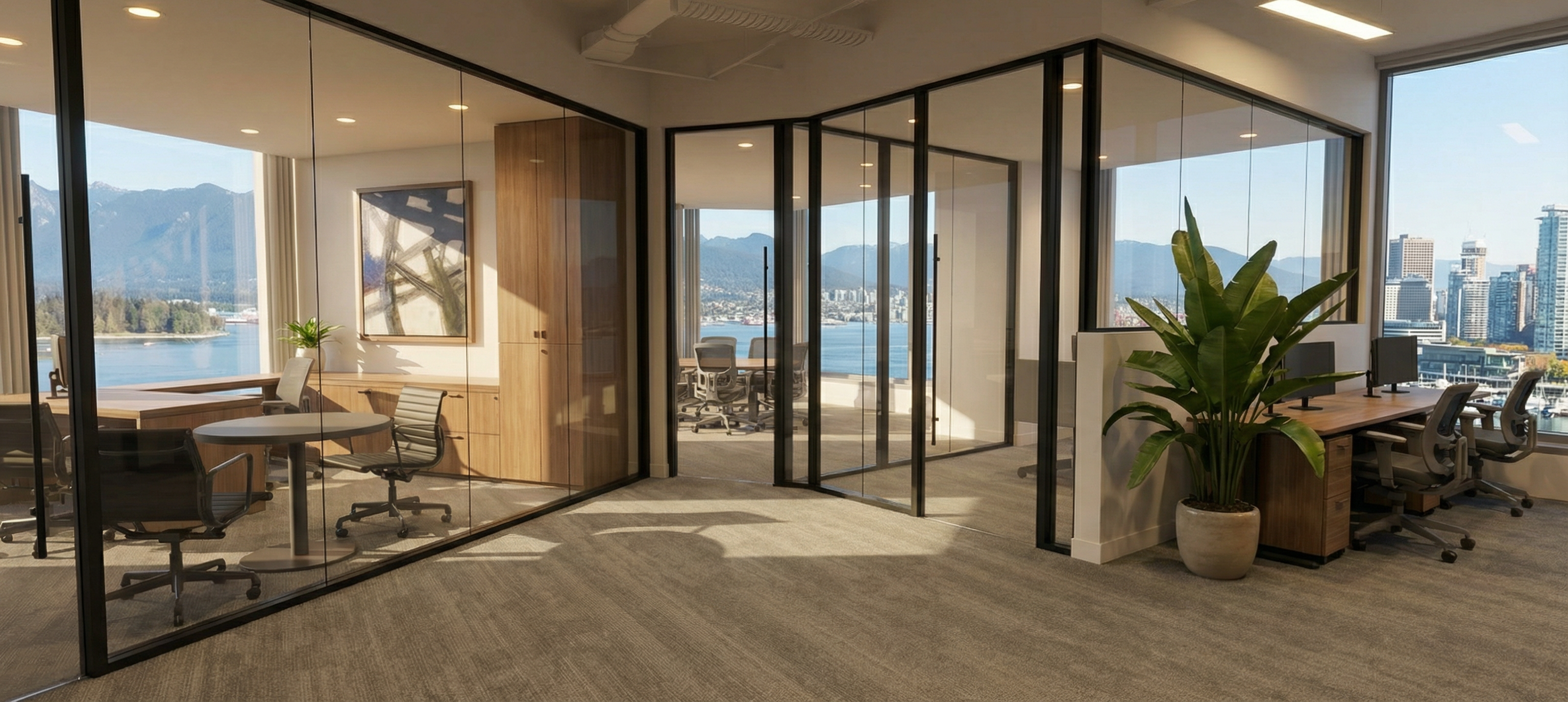 vancouver coal harbour background keep same as original image grey carpet floor make ceilings inside offices flat drywall white keep open ceiling system in open desk area add in lighting 3000k