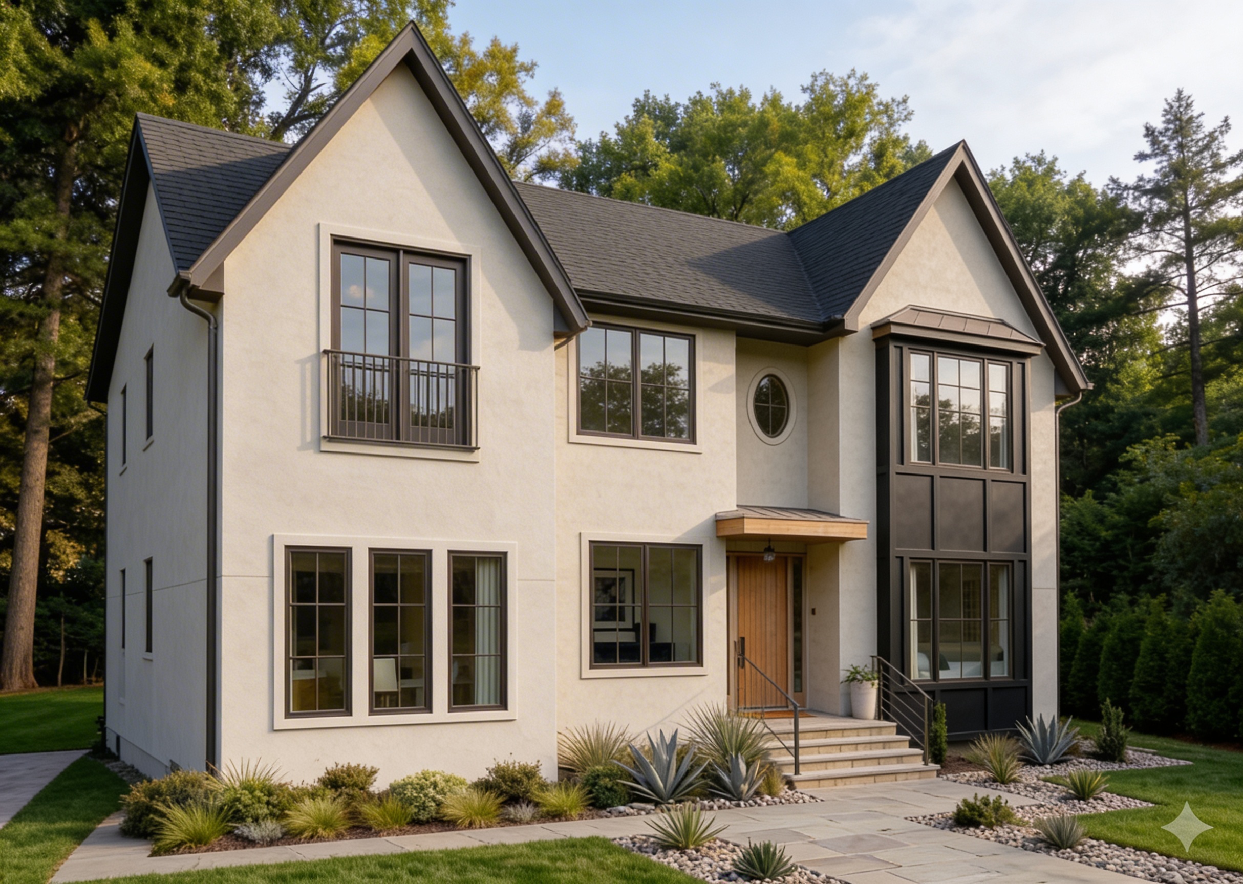 correct the gable roof alignment the gable roof are not straight make the lines straight the metal roof above the bay window does not look metal and the lines are not correct make it correct make everything look realistic