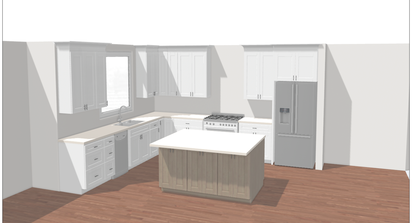 render this kitchen with a beautiful square wood hood that matches the stain and finish of the island cabinets tone down the brightness as if the sun is just going down add 3 pendant lights over the island use 6in matt black handles for all the doors and drawers all upper cabinets should go all the way to the ceiling with sub crown and cove crown on top use the reference image as a guide for the style of the hood use the reference stain sample as the color for the wood hood and island