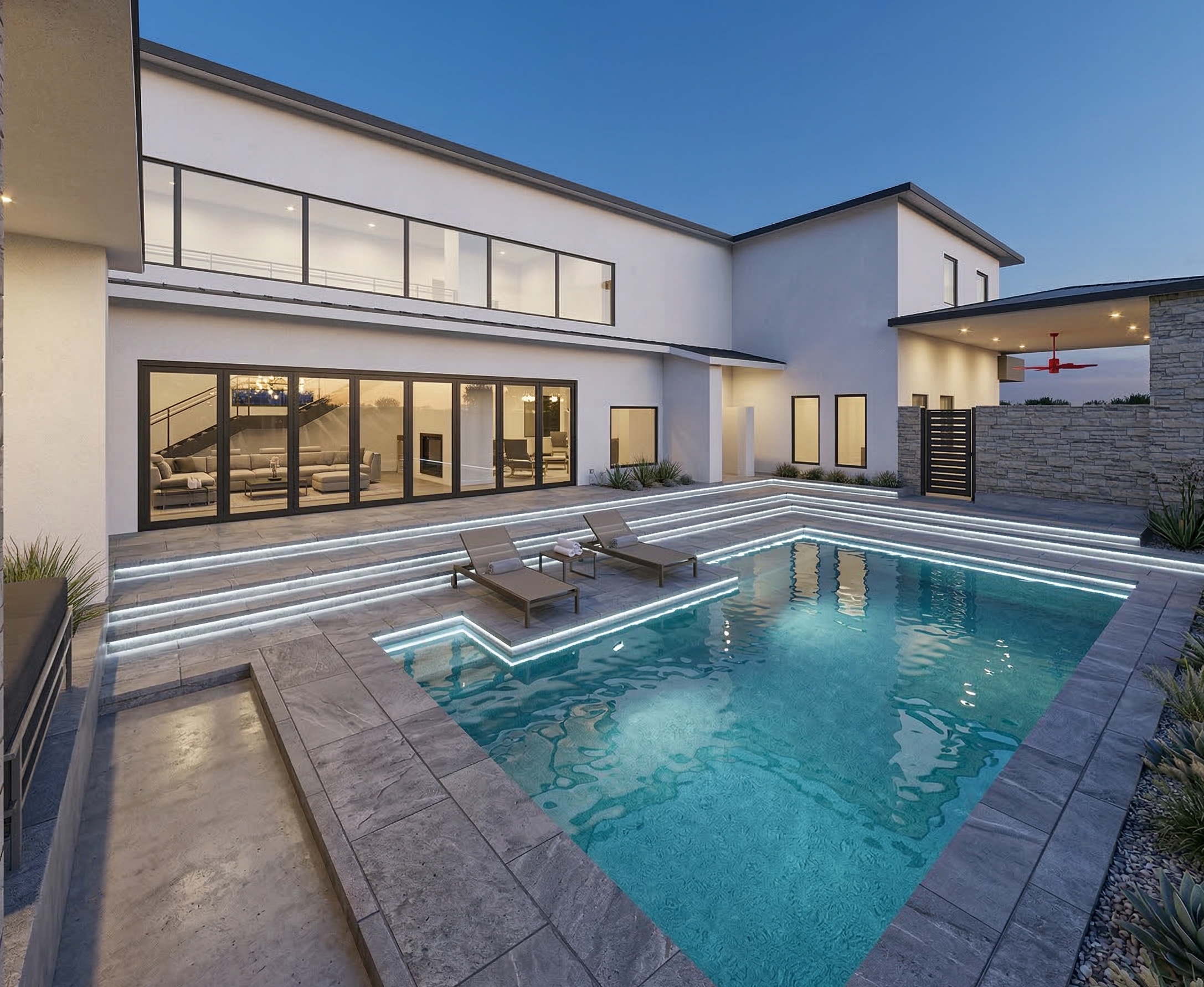 activate this pool in the summer time evening place pavers around the pool brighten up led strip lighting on cascading steps show retractable doors opened to the inside of house
