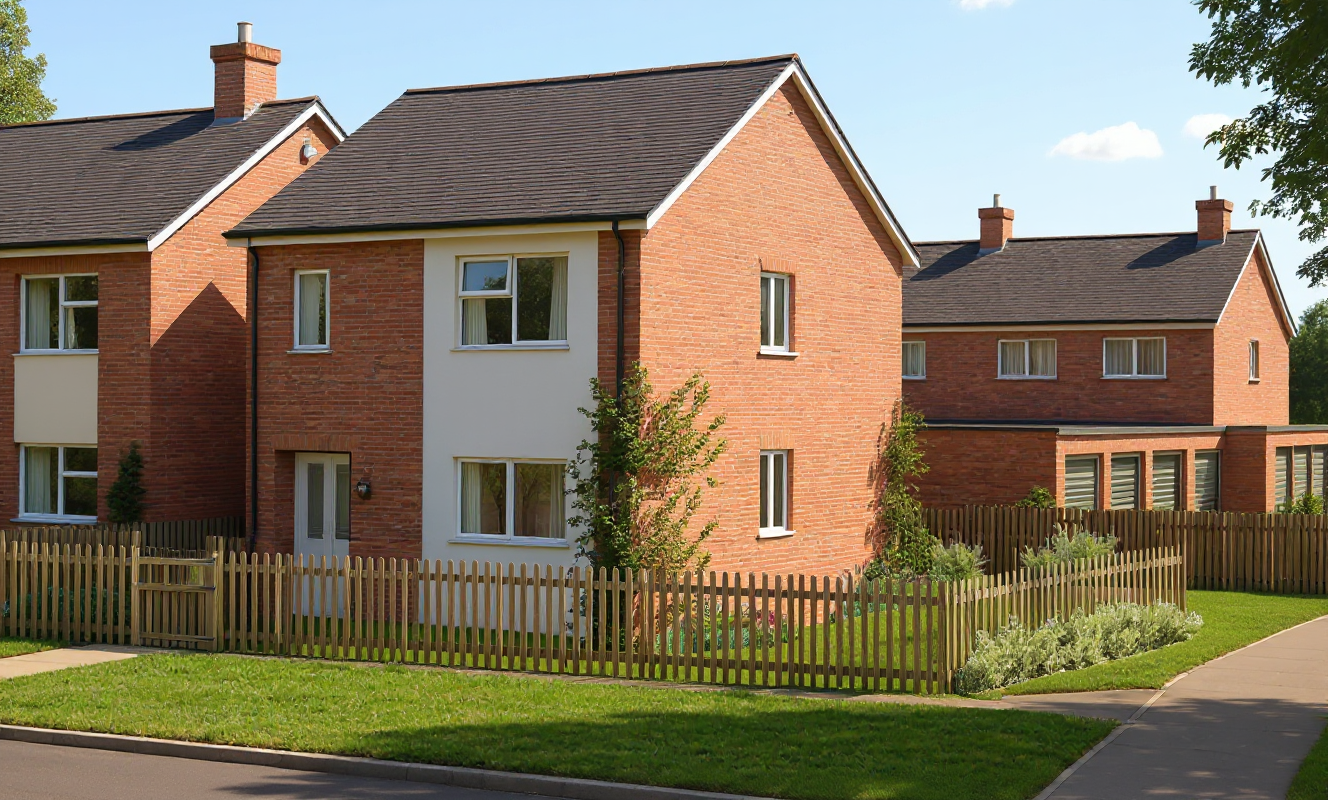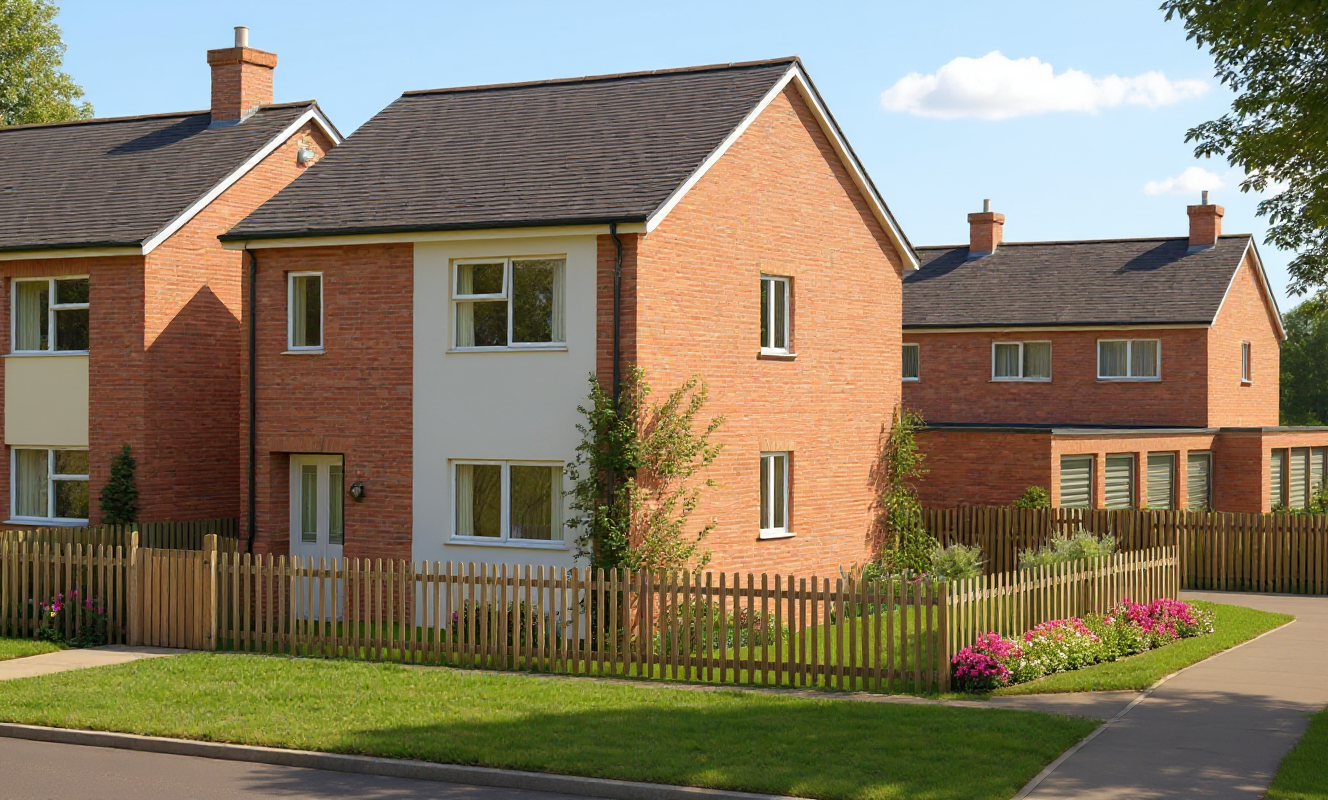 white window frames and white door a light brown brick house with a cream render strip there should be a brown picket fence with a small entrance gate to the left add lush green foliage add flourishing gardens should be a light gray smoothly blending with the serene environment create a peaceful and inviting atmosphere capturing the warmth of a sunny day