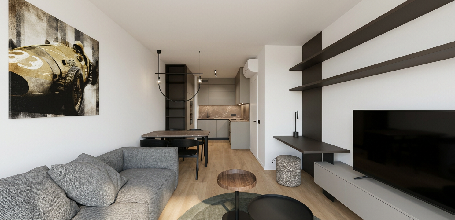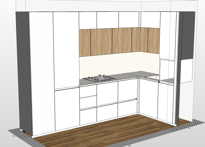 ultra photorealistic interior render based on the provided image preserve exactly the original kitchen layout cabinet proportions wall positions and camera perspective remove all technical labels symbols and construction marks do not modify cabinet colors wood tones countertop material backsplash material flooring tone furniture proportions or layout color fidelity all materials must remain exactly the same color as the reference image no color reinterpretation or tone shift is allowed materials cabinets tall cabinets and base cabinets must appear in matte white lacquer with smooth soft light diffusion back panel the corner wall panels must appear in light natural wood with realistic wood grain countertop and backsplash the countertop and backsplash must be plain white hpl laminate smooth matte surface with subtle soft reflections no marble pattern and no stone texture appliances insert a built in white oven in the tall cabinet the oven must be correctly proportioned and integrated flush with the cabinet front modern minimalist design with white glass front floor maintain the same wood floor tone with realistic grain lighting soft natural daylight balanced architectural lighting subtle ambient bounce light soft shadows under cabinets and along panel joints rendering style high end architectural photography look photorealistic materials sharp textures neutral color grading natural neutral color grading original material colors must remain unchanged