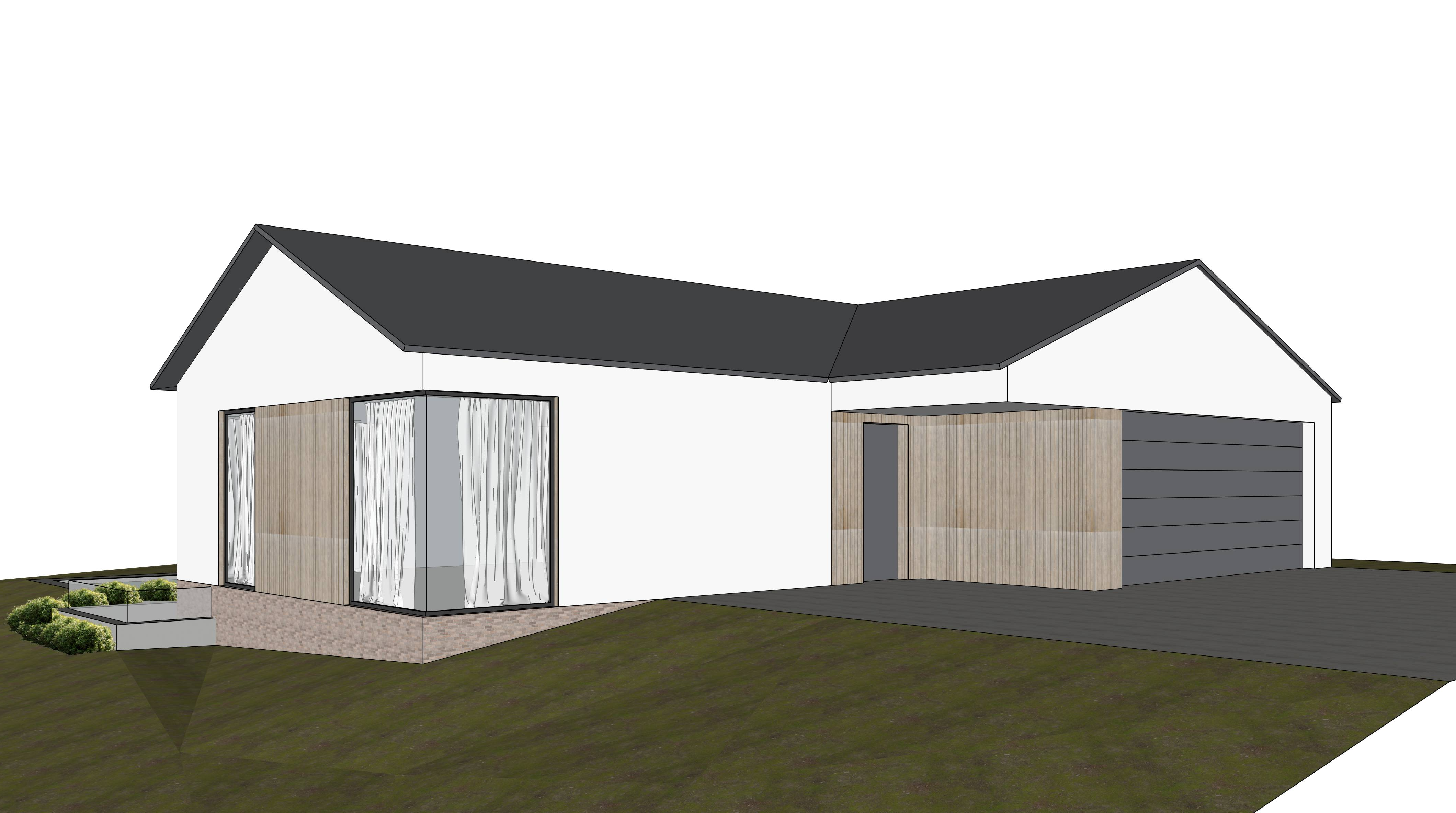 exterior shot modern minimalist house set on a gentle grassy slope light gray exterior with a sleek black roof large panoramic windows with sheer white curtains the wooden paneling is a warm natural oak elegant patio furniture in muted tones complements the house s facade the atmosphere is serene and inviting under a clear blue sky with soft sunlight casting gentle shadows the grass is lush with small well maintained shrubs adding a touch of greenery to the landscape sunny athmosphere