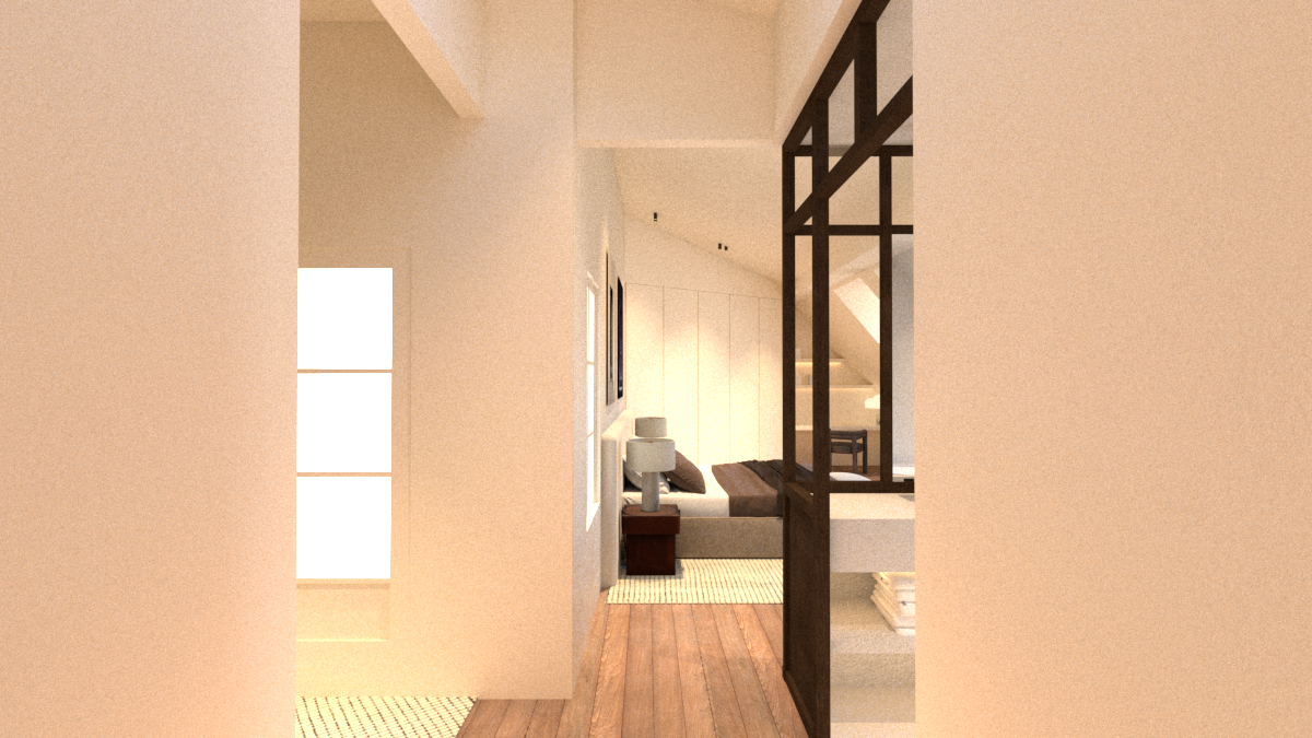 bed linen and pillows are pure white glass partition wall is made of tinted medium oak