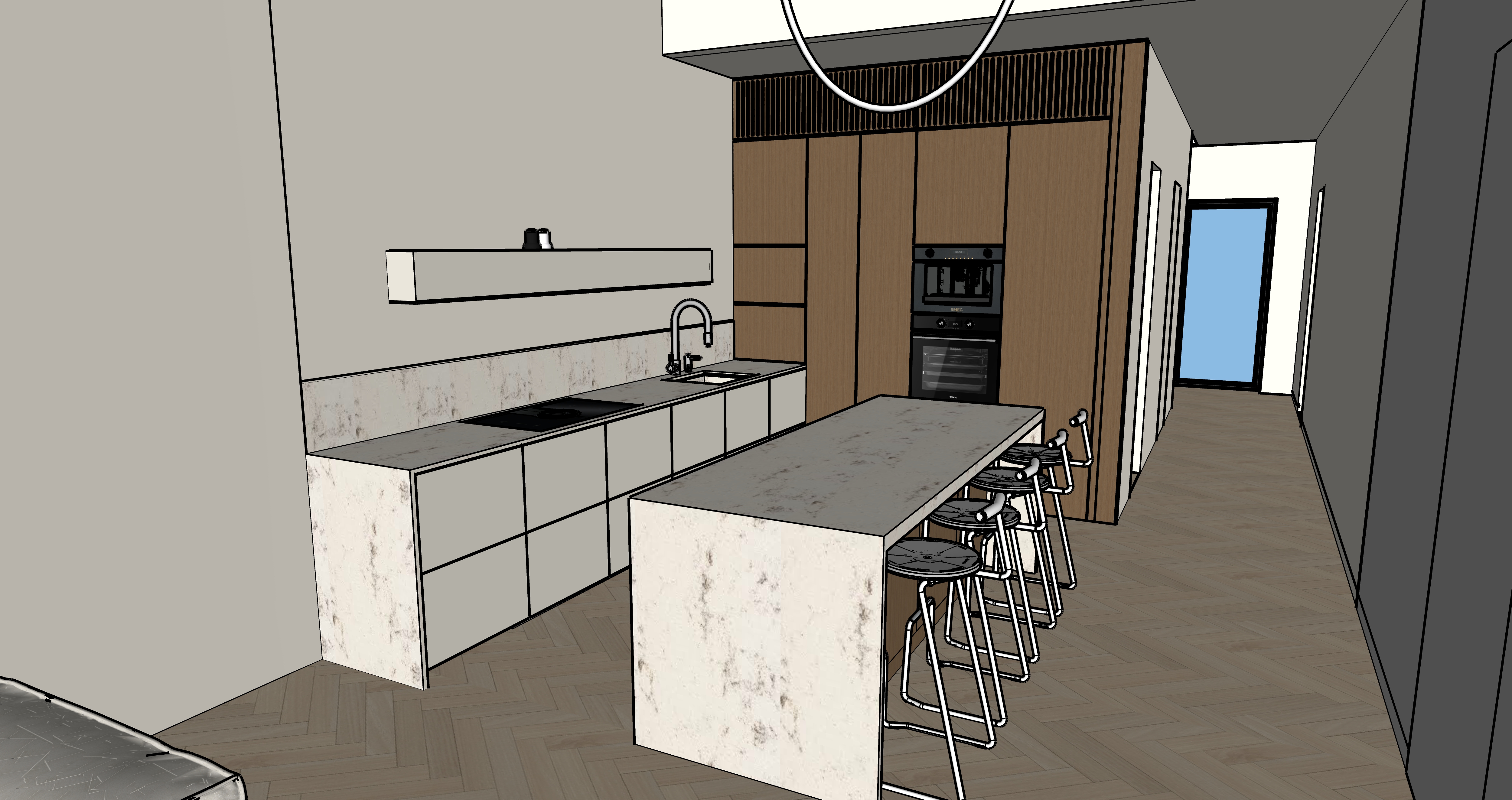interior shot lighter floors chairs all chrome no skirting boards needed spot light in pairs of two lamps in the hall ant above tall caminets through the window show a cobblestone yard about 5m long and a fence with greenery behind it