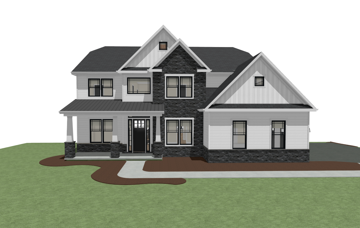 render this 3d image to appear photo realistic maintain all existing architectural materials and structural elements exactly as shown enhance the setting with a well maintained landscape include minimal beds manicured shrubs and a tree lined backdrop that frames the home naturally the windows should have a glossy finish with clear reflections of the surrounding trees and sky lighting should feel natural with soft shadows and realistic depth to bring the scene to life