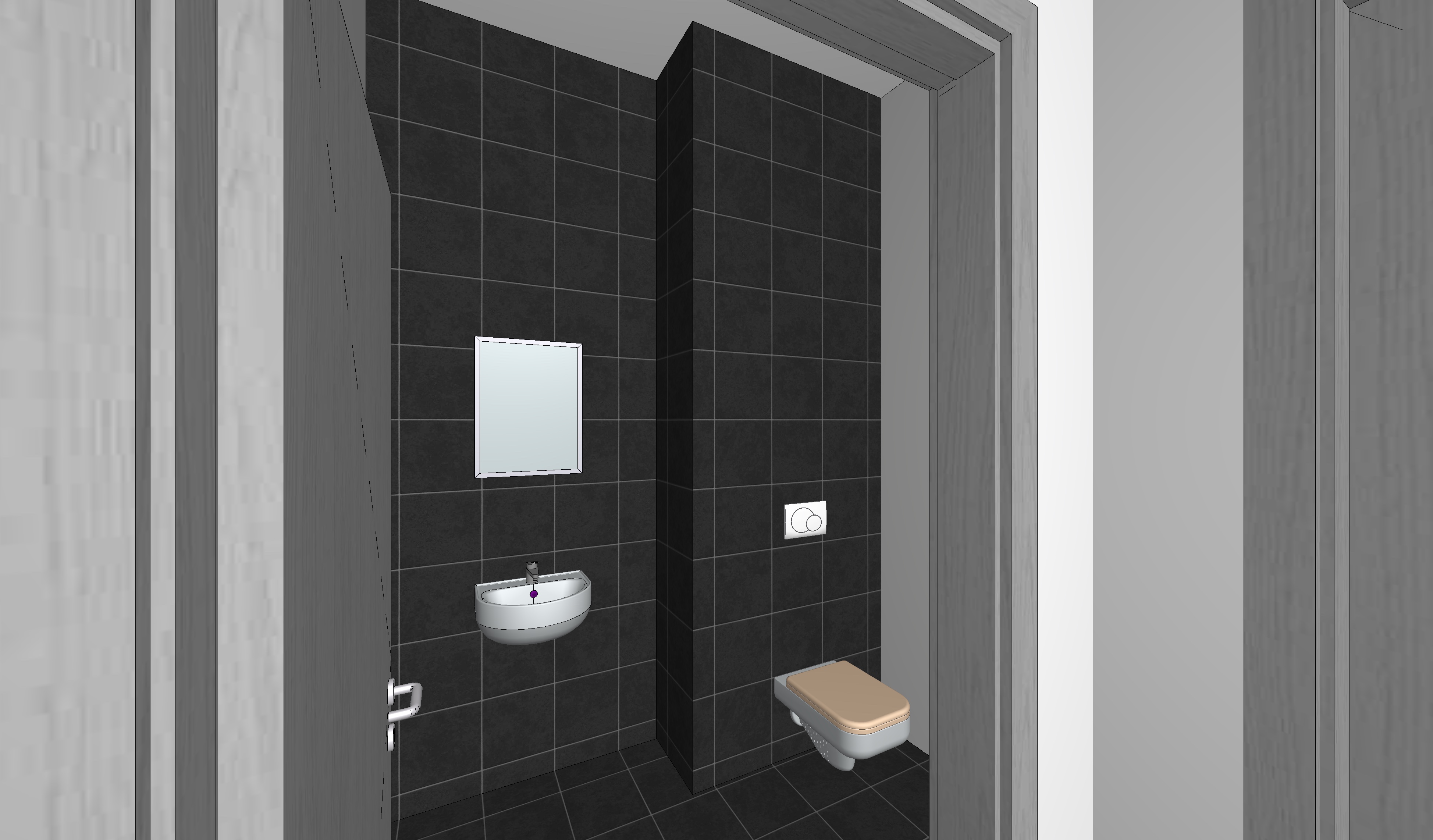create a clean highly realistic architectural render of a small modern bathroom the floor is covered with 30x30 cm dark grey ceramic tiles all walls are fully covered with 30x30 cm dark grey ceramic tiles the same tile format as the floor the tiles cover every wall surface from floor to ceiling including all visible wall faces and the sides of the partition wall subtle grout lines and a slightly matte finish layout on the left wall a small wall mounted round sink with a minimalist chrome faucet above the sink a simple rectangular frameless mirror on the right side a wall hung toilet with a concealed cistern and a light beige seat a small partition wall separates the toilet from the sink area and this partition wall is also fully tiled on all sides with the same 30x30 cm dark grey tiles a modern flush plate is installed on the tiled wall above the toilet style minimalist contemporary bathroom clean lines dark grey tiles contrasted with white ceramic sanitary fixtures lighting and render soft natural lighting realistic shadows global illumination physically accurate materials photorealistic architectural visualization high detail 4k render