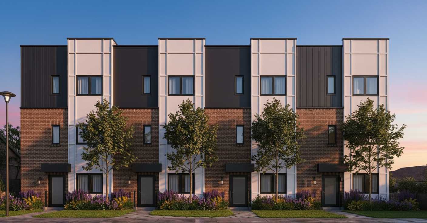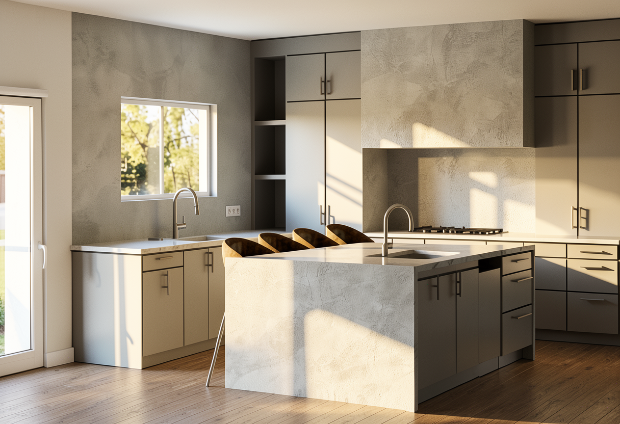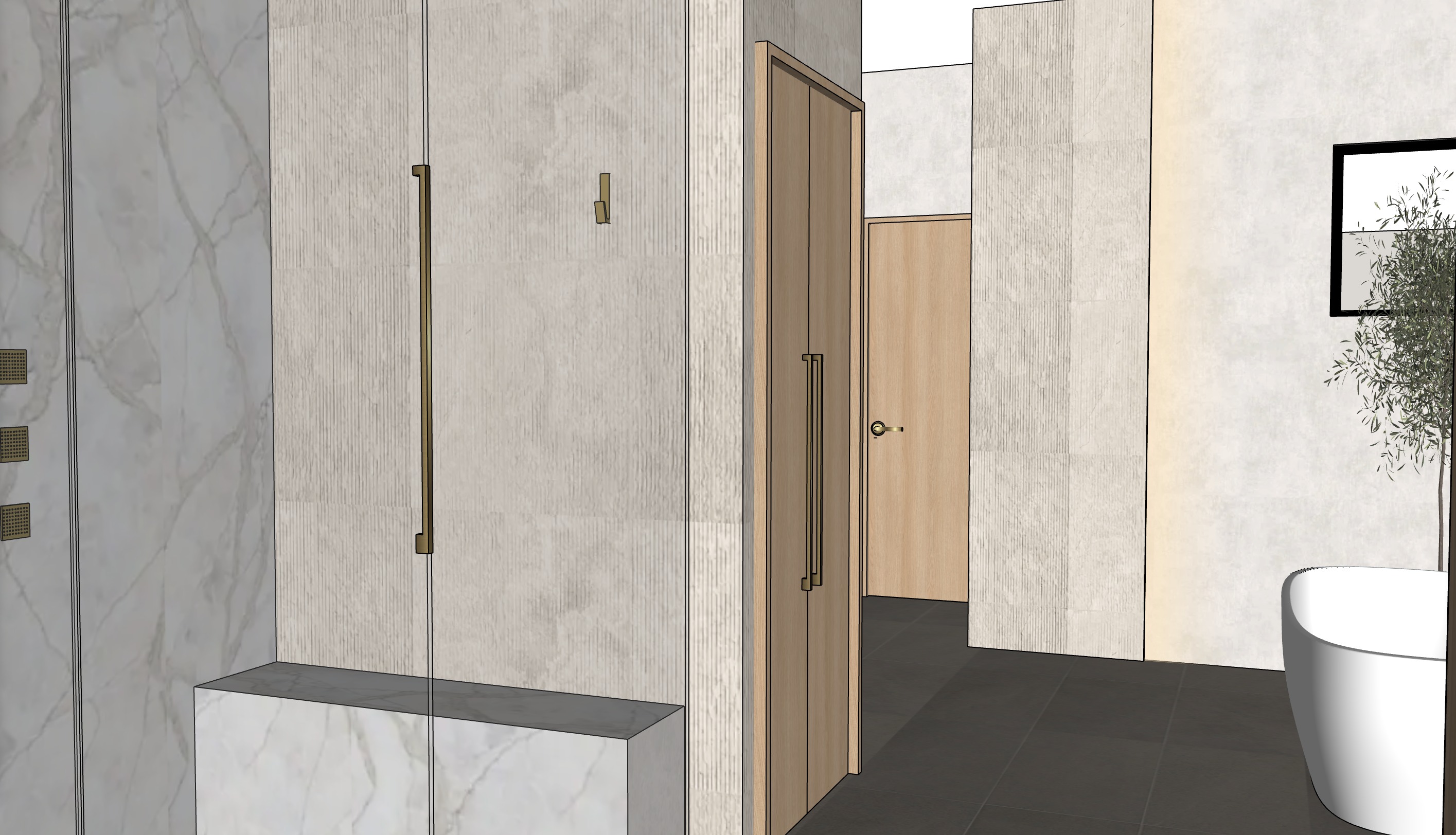 master bath with off white plaster walls vertical stone tile in shower with marble on left side lighter white oak wood flooring is a matte stone gray tan windows on 2nd floor with tree landscape see more plaster look on walls back wall vertical stone fluted tile with a soft linear light glow on plaster wall