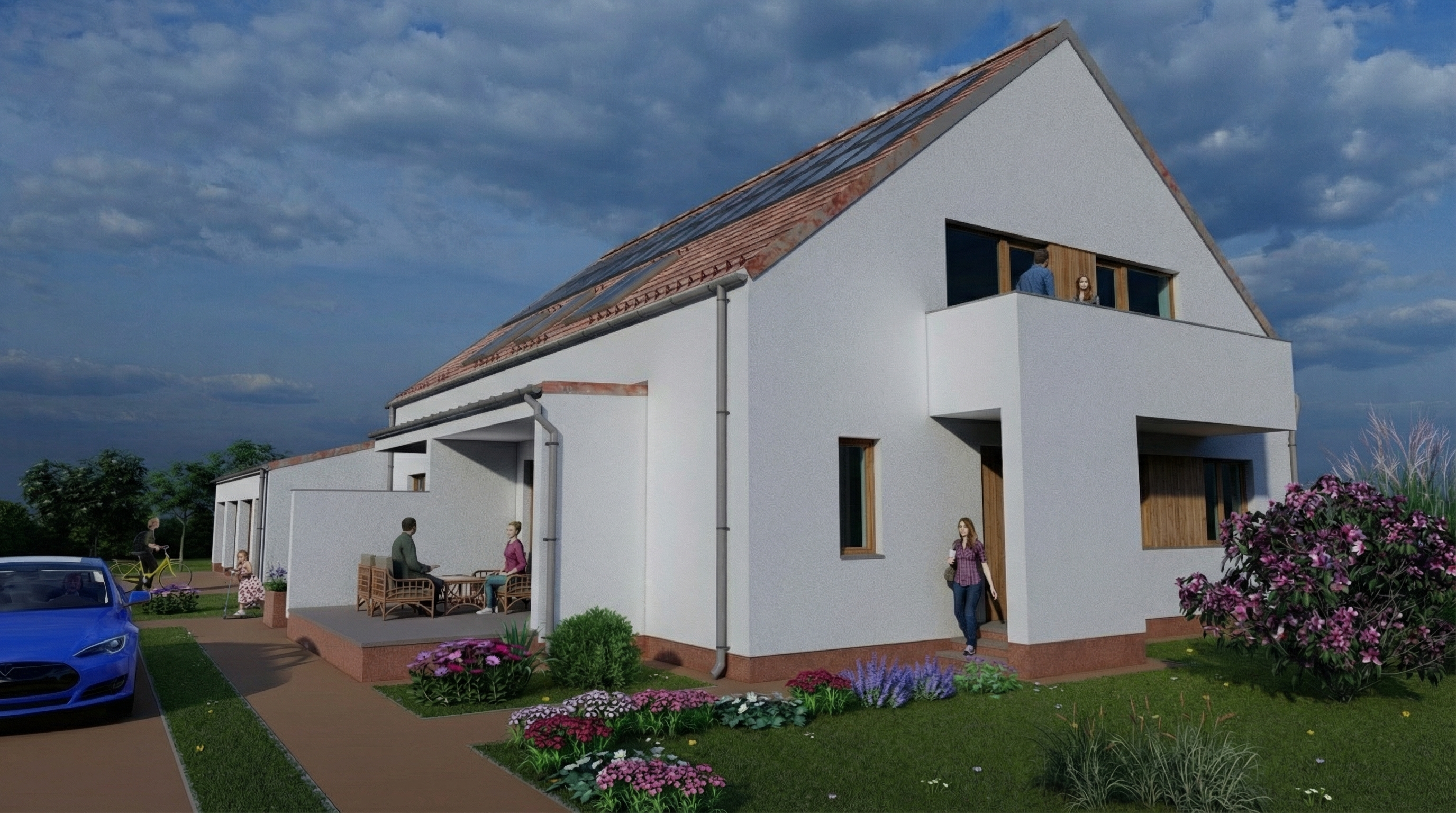 the villa is surrounded by a lot of trees bushes and flowers in the garden