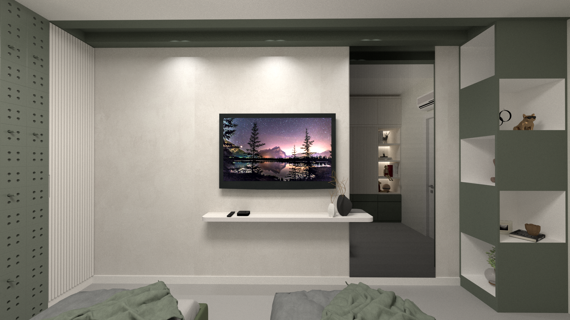 create a serene and modern twin bedroom with soft natural lighting use a harmonious color palette with sage green as the main color for the cabinetry and bed backdrops accentuate with muted grays and off white tones for the bedding and wall panels include textured plush bedding in soft gray with subtle green throws incorporate warm white lighting from an elegant modern ceiling fixture creating a cozy and inviting atmosphere add elements like books and toys in open shelves with soft ambient lighting for a homely touch