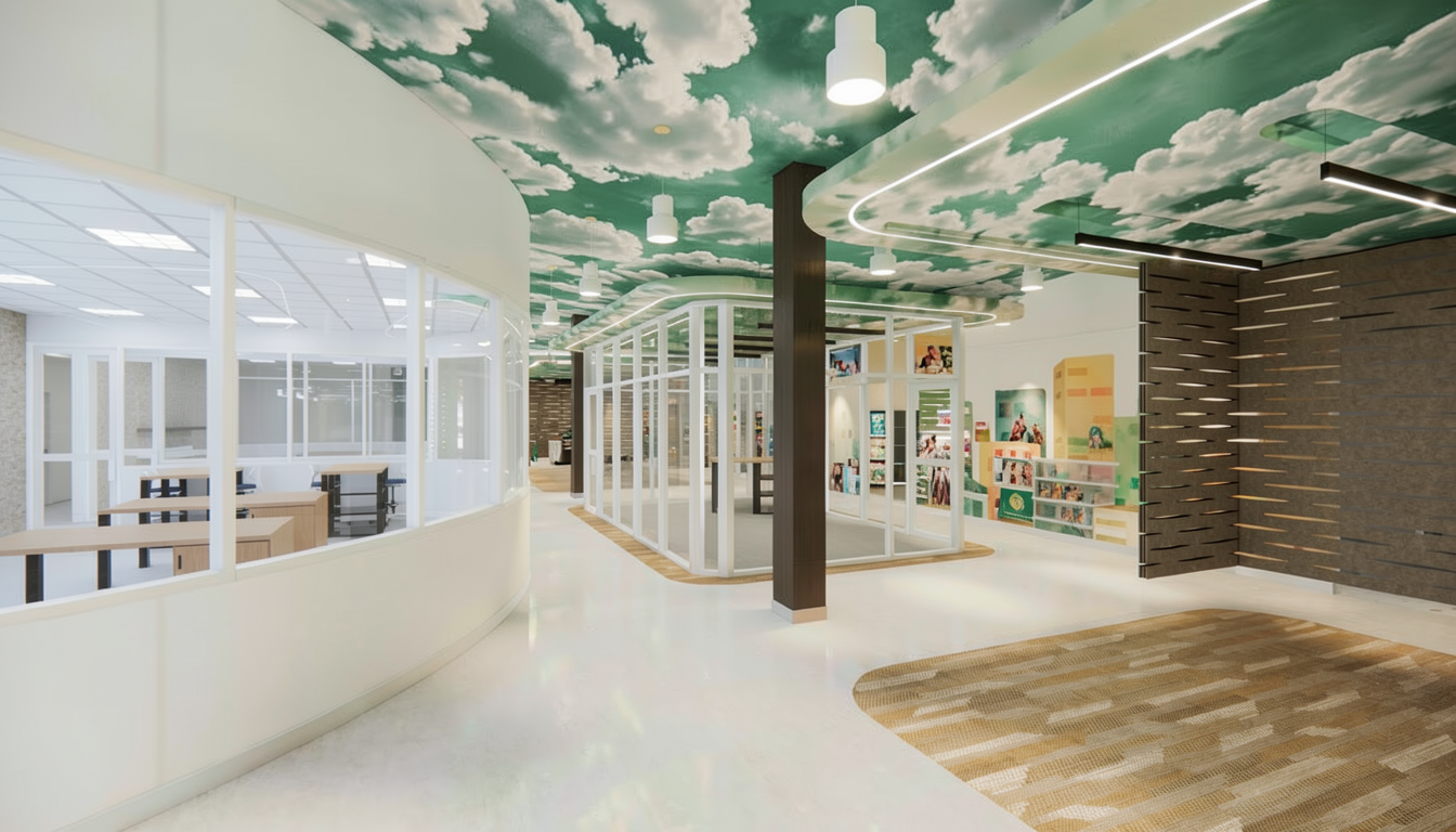 show exposed structure above the green ceiling clouds make it painted white add small retail vignettes under the green ceiling clouds