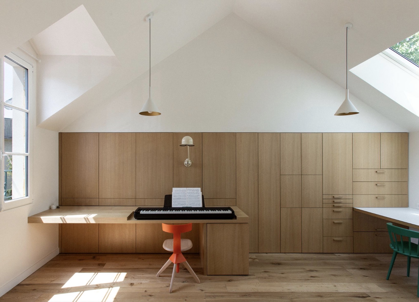 ad books on right desk a case with some branches on the central desk put olso aerobics i want to be able to read the titles dali picasso beige curtains in front of left window realistic light getting through